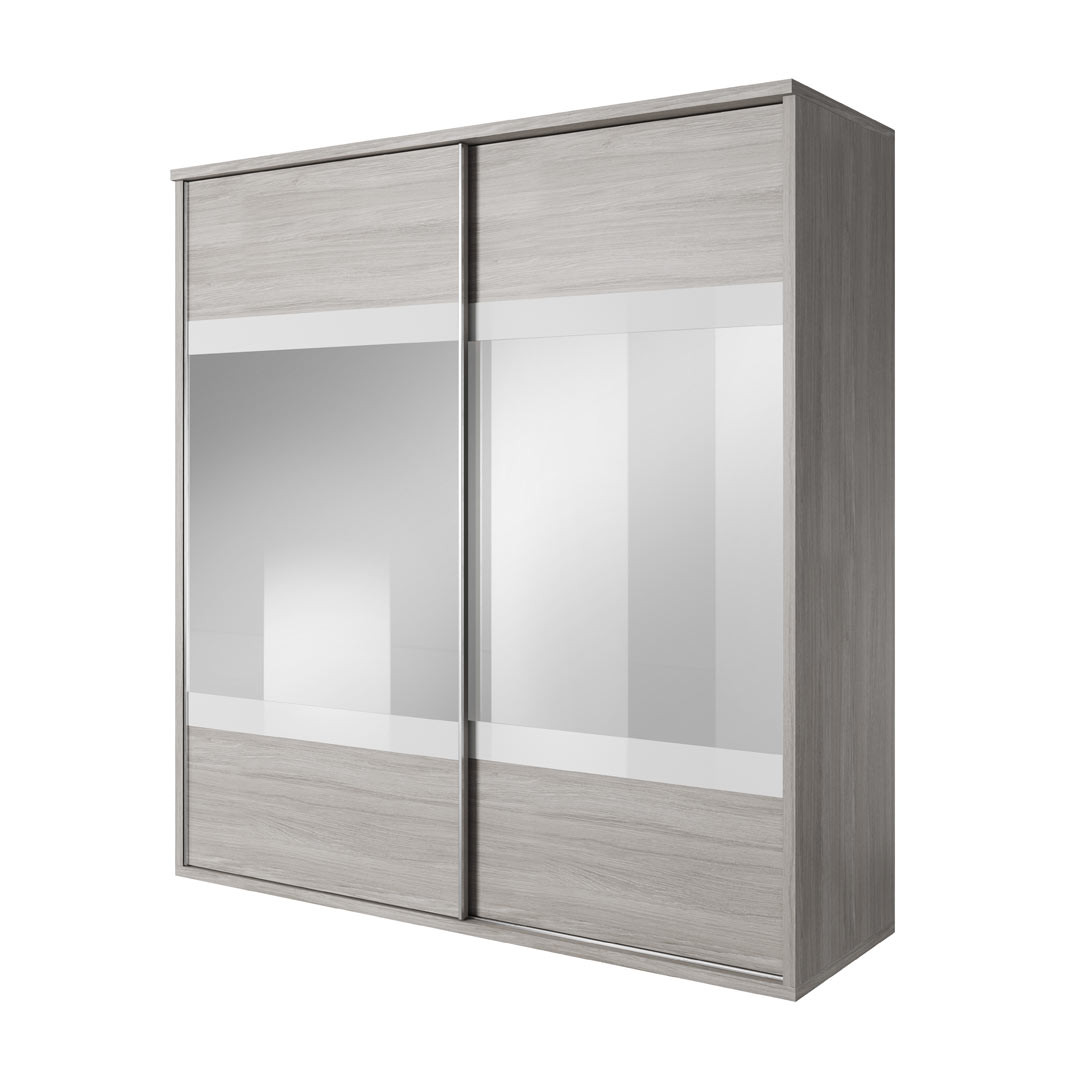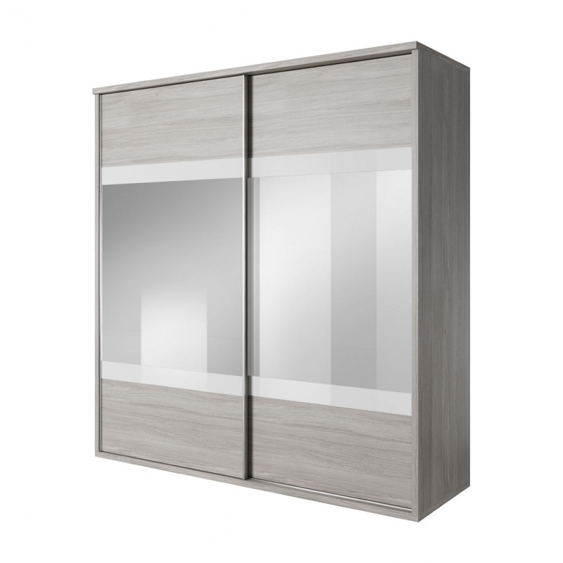 L’armoire est une double penderie, qui s’ouvre largement sans prendre de place grâce à ses deux portes coulissantes. Ses dimensions 200 x H 210 x P 65 cm offrent un espace suffisant pour deux personnes. Ses portes sont munies de deux larges miroirs, ce qui confère praticité et gain de place considérable, ainsi qu’une impression de grandeur de la pièce.