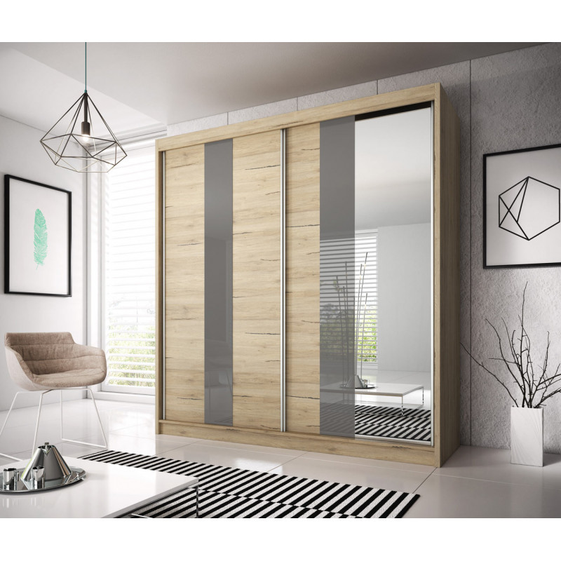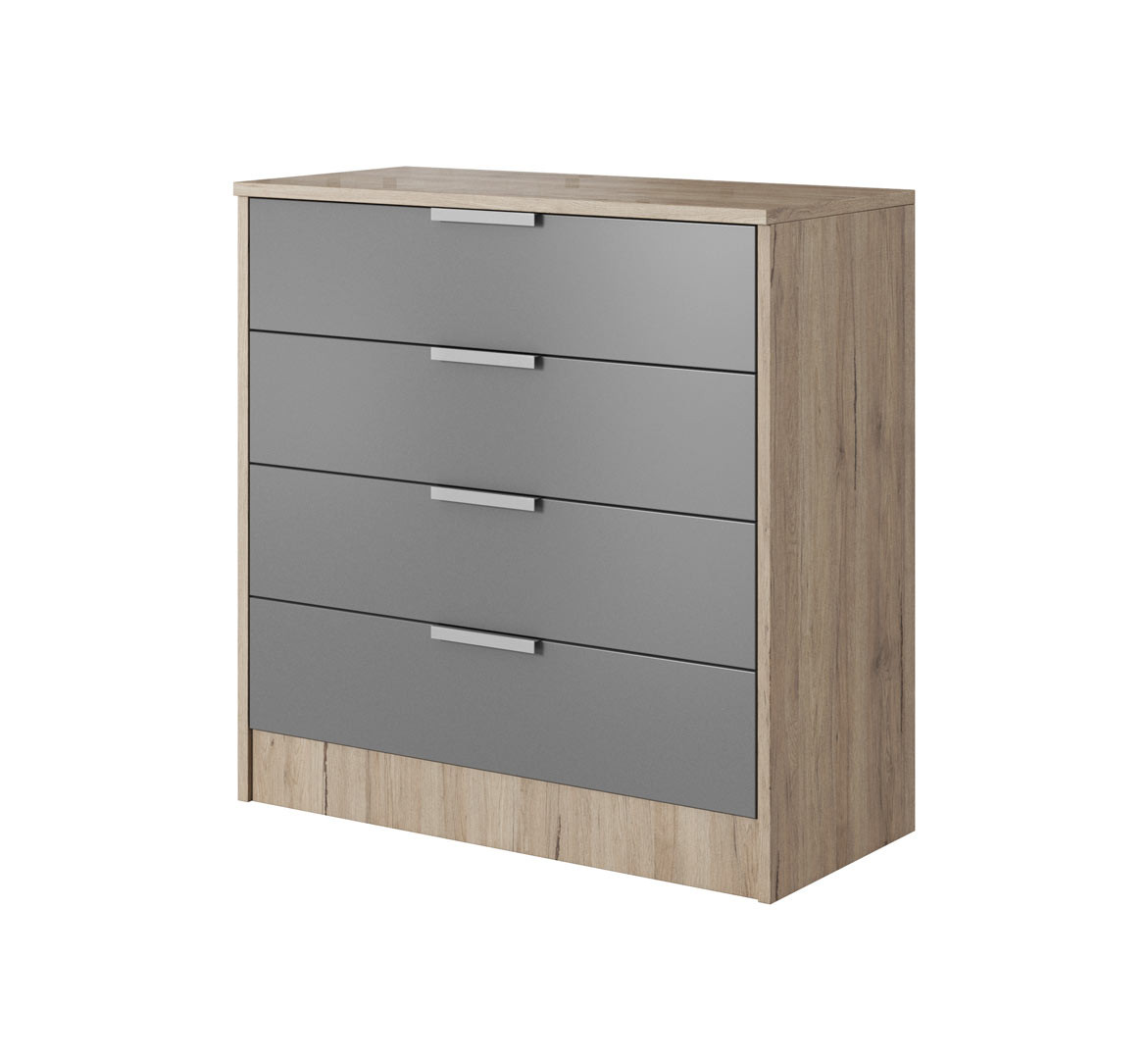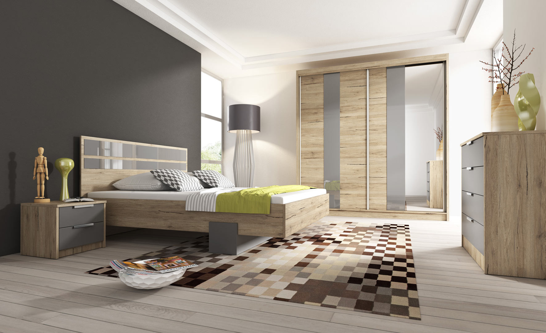 | Structure | Panneaux de particules mélaminés de première qualité - décor gris en verre pour l'armoire et le lit - décor papier gris pour le chevet et la commode |