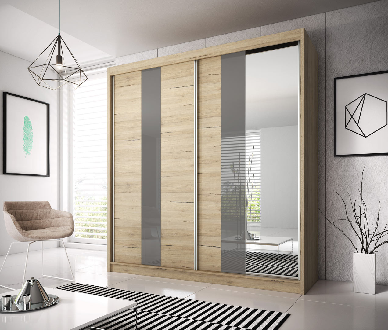 Elle se compose de cinq éléments : une armoire deux portes coulissantes avec miroir, un lit offrant un couchage 160 x 200 cm, une commode quatre tiroirs et deux chevets deux tiroirs.