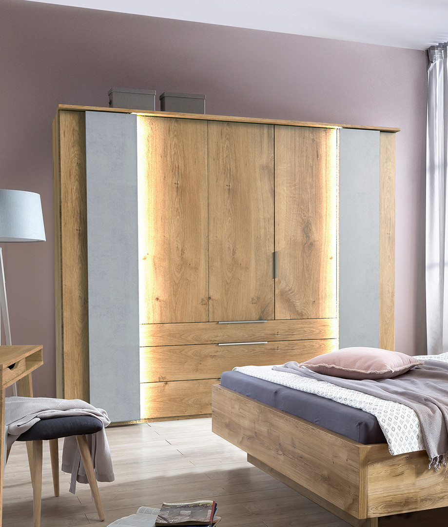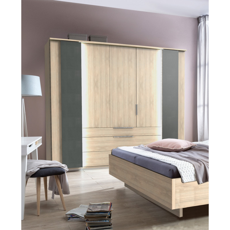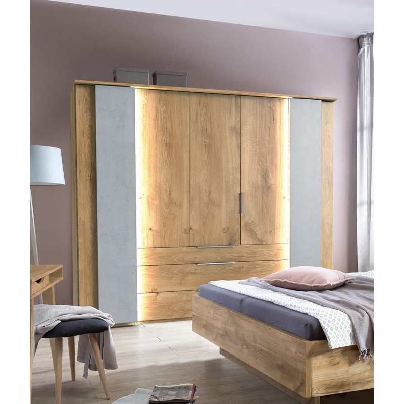 La chambre adulte complète contemporaine Olsen est fabriquée en panneaux de particules de première qualité recouverts d'un décor. Elle se compose de quatre éléments : un lit réglable en hauteur avec éclairage Led disponible dans deux dimensions de couchage, une armoire portes battantes (éclairage non inclus) et deux chevets.