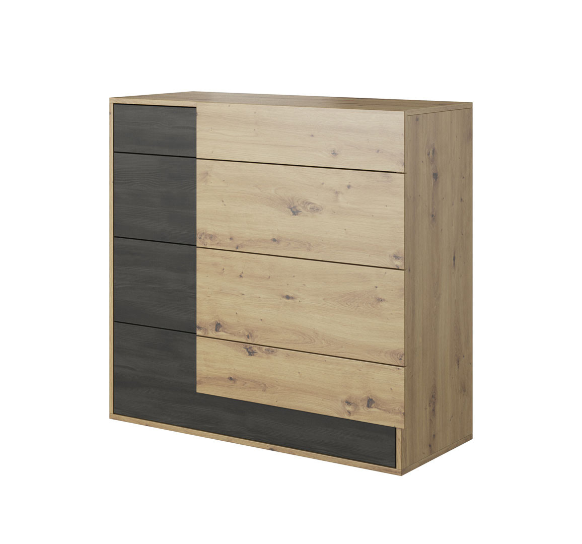 Vous souhaitez vous offrir une chambre complète, à la fois moderne et sobre ? Notre chambre adulte moderne chêne/noir France est idéale pour donner un esprit tendance à votre chambre à coucher. Elle se compose de cinq éléments : un lit, deux chevets, une armoire dotée de 4 portes battantes et d’un miroir, et une commode. Ils sont tous fabriqués en Europe et composés d’une structure en panneaux de particules de première qualité recouverts d'un décor. Leur coloris mêlant le chêne et le noir donne à cette chambre un look à la fois lumineux et design.