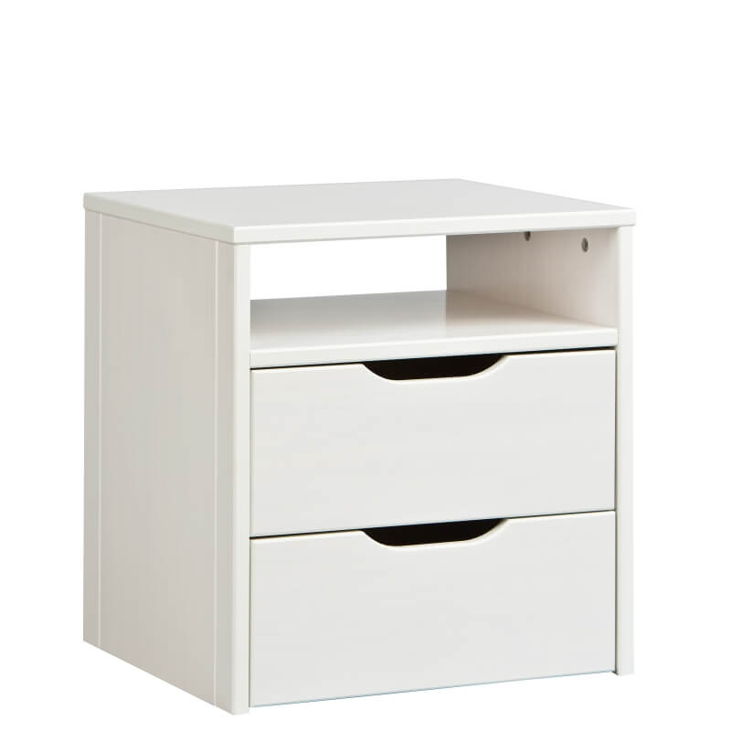 Le chevet contemporain Lauriane sera complémentaire du lit enfant et du lit adulte contemporain Lauriane. Sa structure est fabriquée en pin massif recouvert d'un vernis blanc étanche et facile d'entretien. Il se compose de deux tiroirs montés sur coulisses métalliques et d'une niche ouverte.