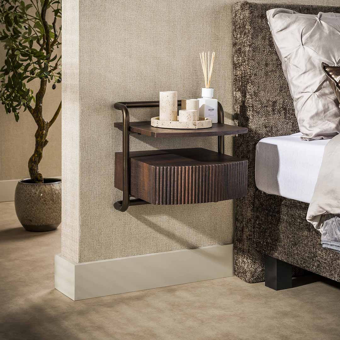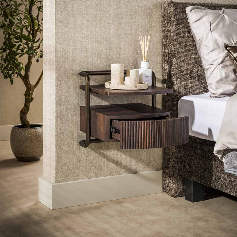 Apportez une touche authentique et raffinée à votre espace nuit avec ce chevet suspendu signé Vivabita, conçu avec soin en Hollande. Véritable alliance entre le métal et le bois, ce modèle séduit par son coloris brun foncé chaleureux et sa structure en cadre métallique rond bronze thermolaqué qui lui confère un caractère affirmé. Pensé pour les amateurs de déco urbaine, ce chevet adulte apporte une élégance brute et contemporaine à n'importe quel intérieur, tout en optimisant l'espace au sol grâce à sa fixation murale pratique et discrète.