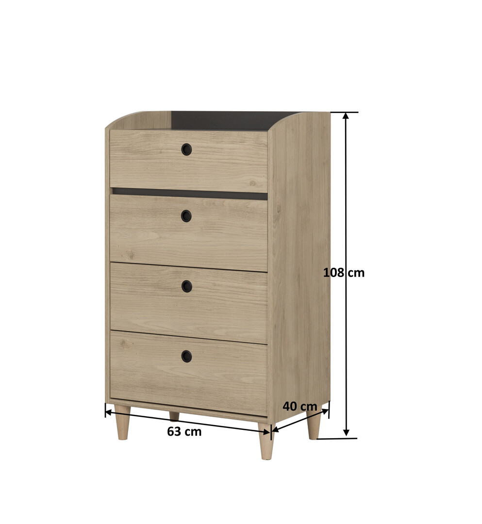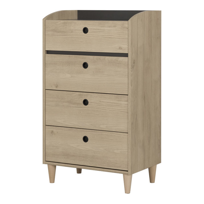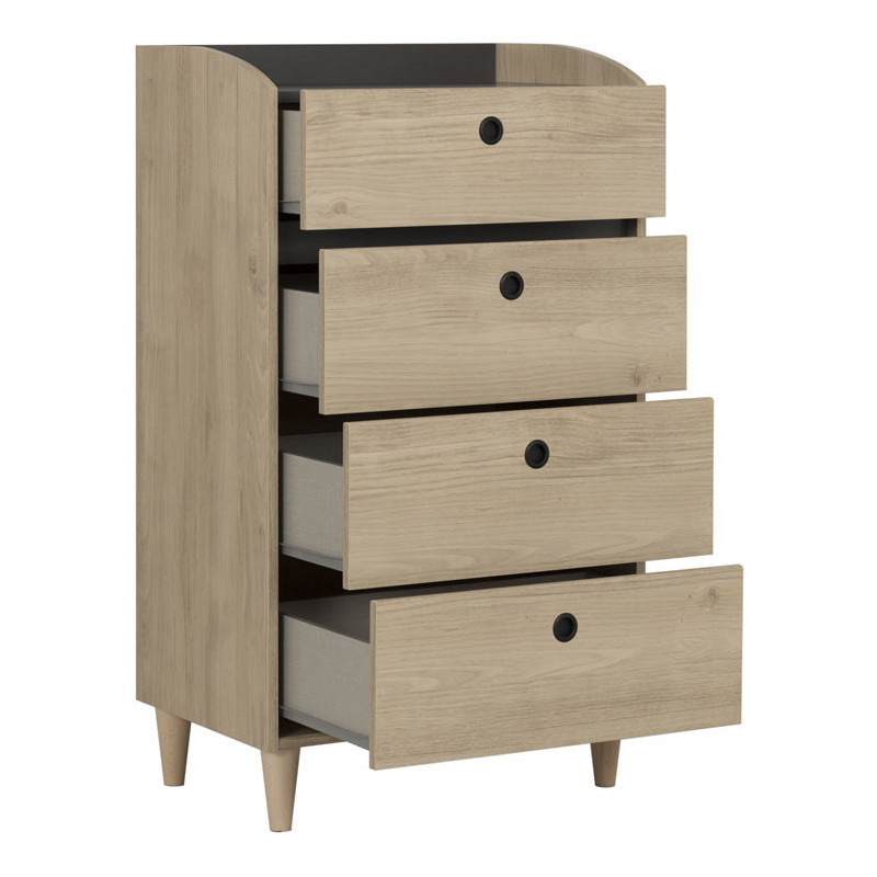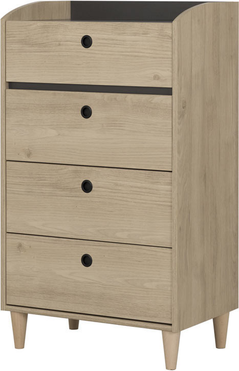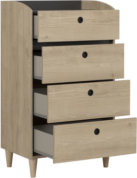 Faites entrer une touche de fraîcheur et de nature dans votre chambre à coucher avec le chiffonnier Shiva. Son style scandinave à l'allure épurée charmera sans conteste les amoureux de la simplicité et de la zénitude. En complément de votre armoire, il offrira un espace de rangement supplémentaire appréciable pour ranger vos vêtements ou linge de lit au fil des saisons. Il se compose de quatre grands tiroirs montés sur coulisses à galets et dotés de poignées en ABS noir pour une excellente prise en main.