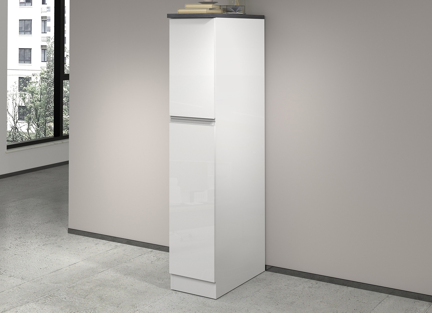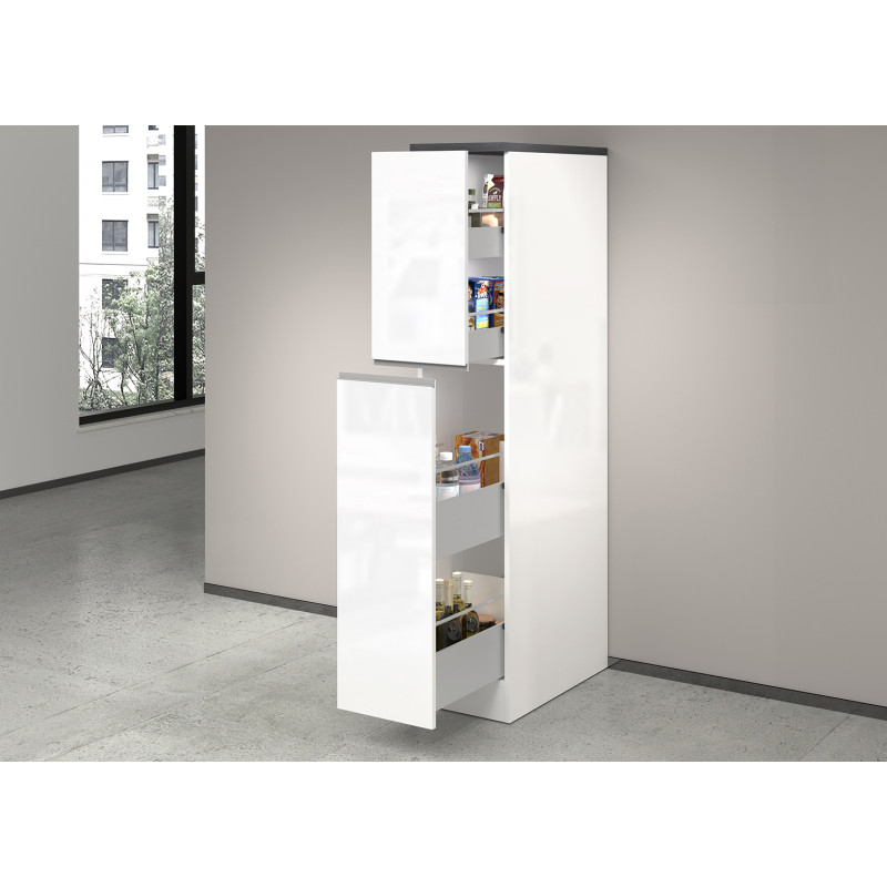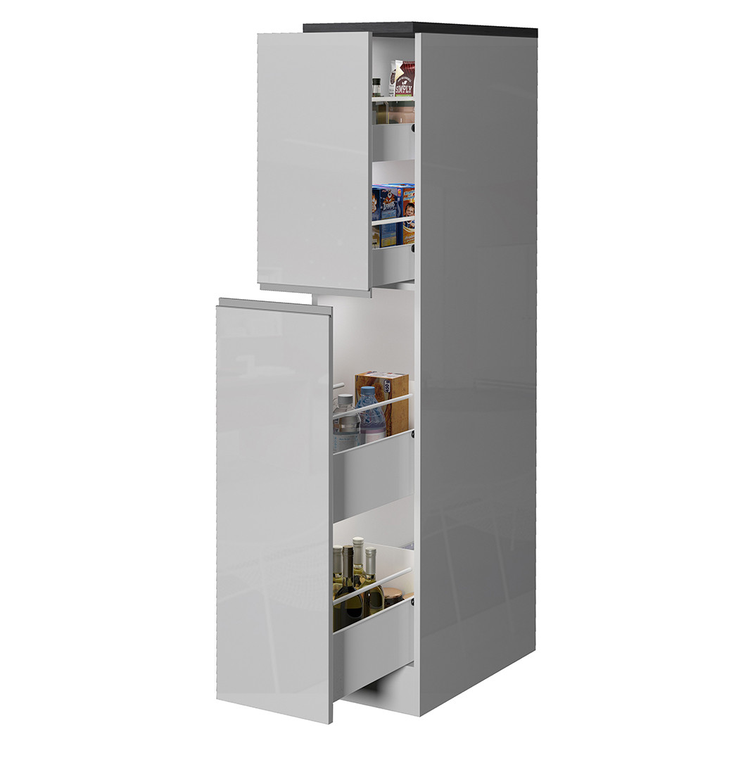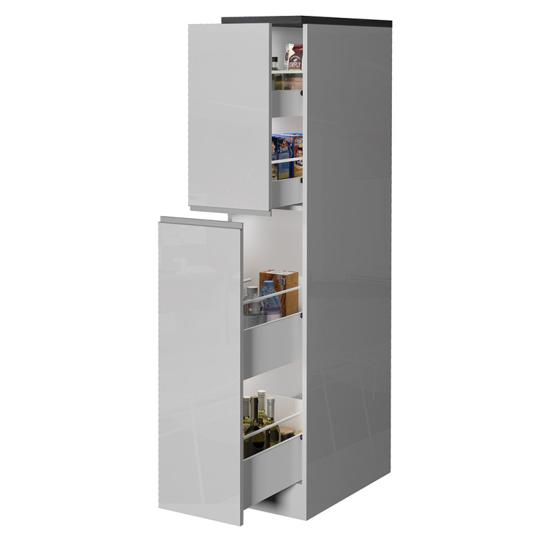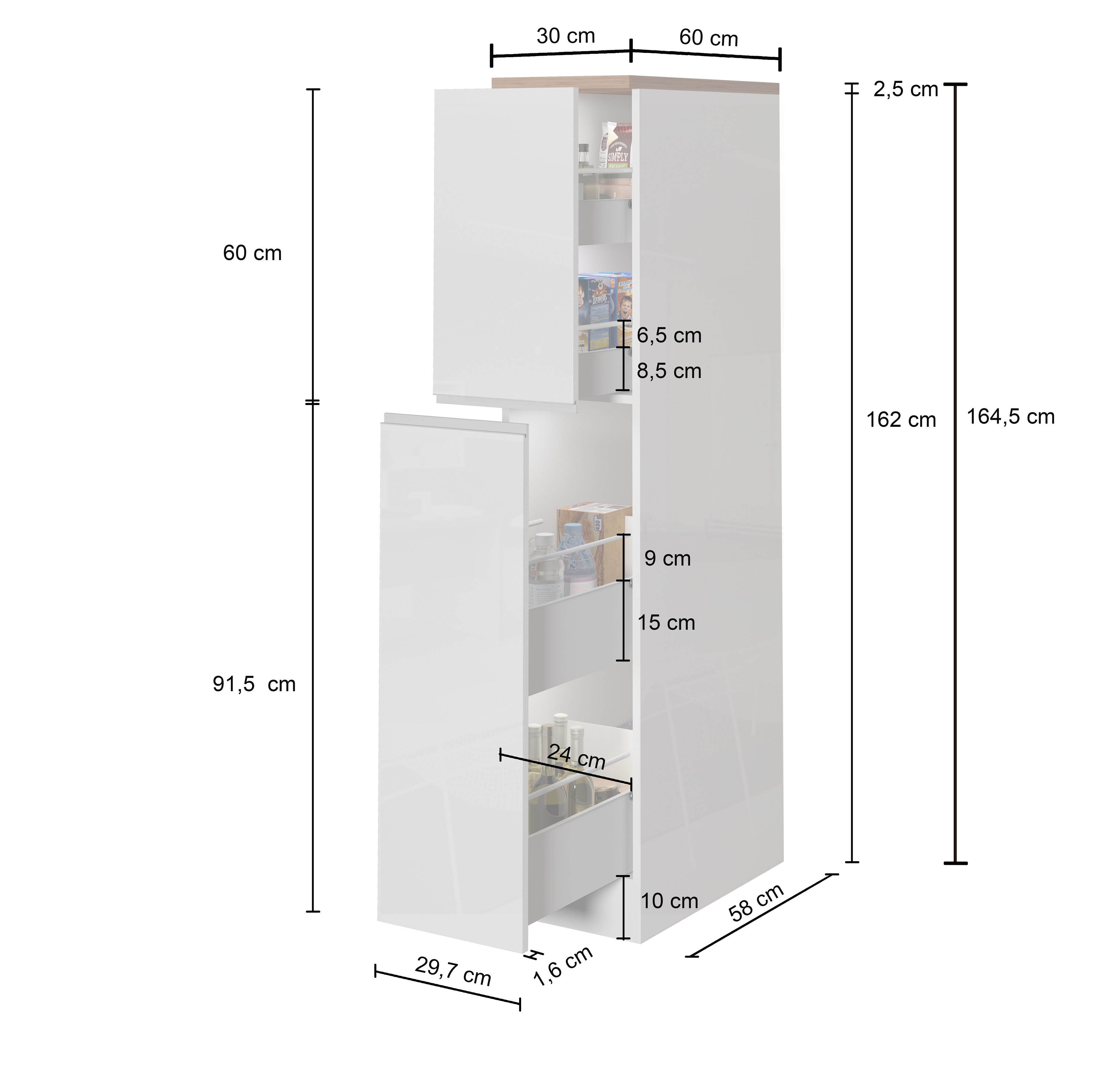 Avec ses dimensions pratiques (30 cm de large, 165 cm de haut et 60 cm de profondeur), cette colonne s’intègre facilement dans toutes les cuisines, même les plus compactes. Sa finition blanc mat pour le corps et blanc brillant pour les façades, associée à un plateau effet béton, en fait un choix parfait pour les intérieurs au style moderne. Le système d’ouverture Soft Close garantit une utilisation fluide et silencieuse au quotidien. Que vous l’utilisiez comme colonne de cuisine pour y ranger vos provisions ou vos petits appareils, ou comme espace complémentaire, elle s’adapte à vos besoins avec élégance.