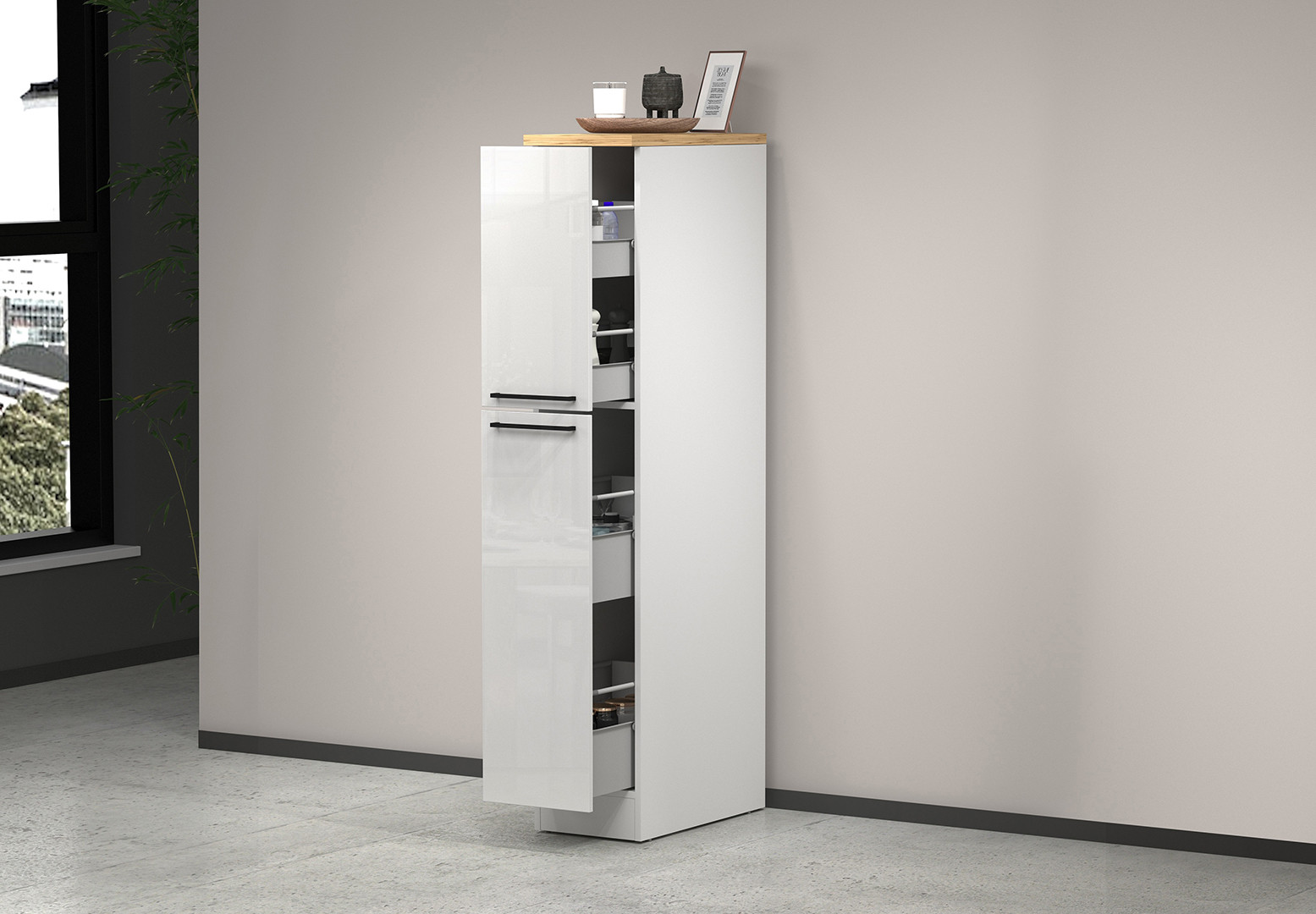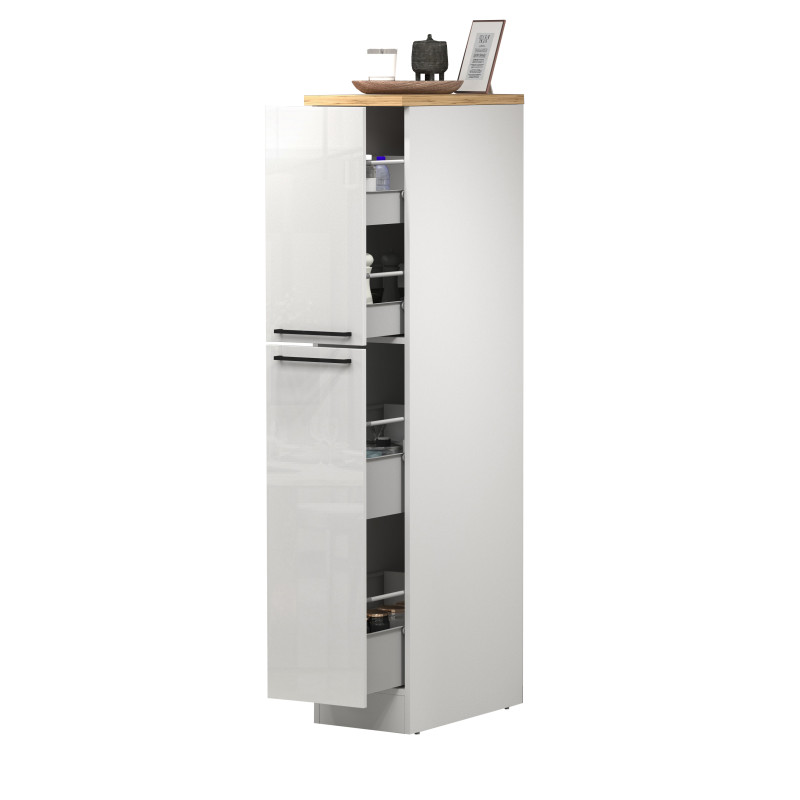 Ce meuble se distingue par ses deux tiroirs à fermeture Soft Close, alliant confort d'utilisation et discrétion. Les poignées en aluminium renforcent l’esthétique épurée du meuble, tout en offrant une excellente prise en main. Parfait pour compléter une cuisine existante ou pour créer un agencement harmonieux, il se transforme facilement en colonne de cuisine dédiée à vos ustensiles ou provisions. Son entretien est très simple : un chiffon doux et légèrement humide suffit pour préserver sa brillance et son apparence d'origine.