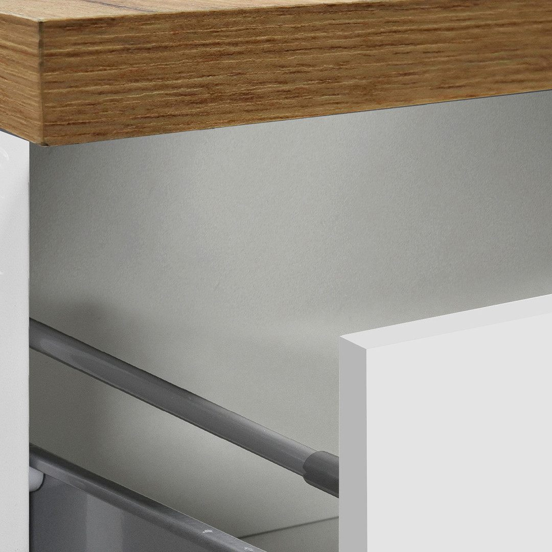 | Structure | Panneaux de particules mélaminés de première qualité de 16 mm d'épaisseur (corps : blanc mat/façades : blanc brillant) - plateau 25 mm avec chants ABS - poignées en aluminium |