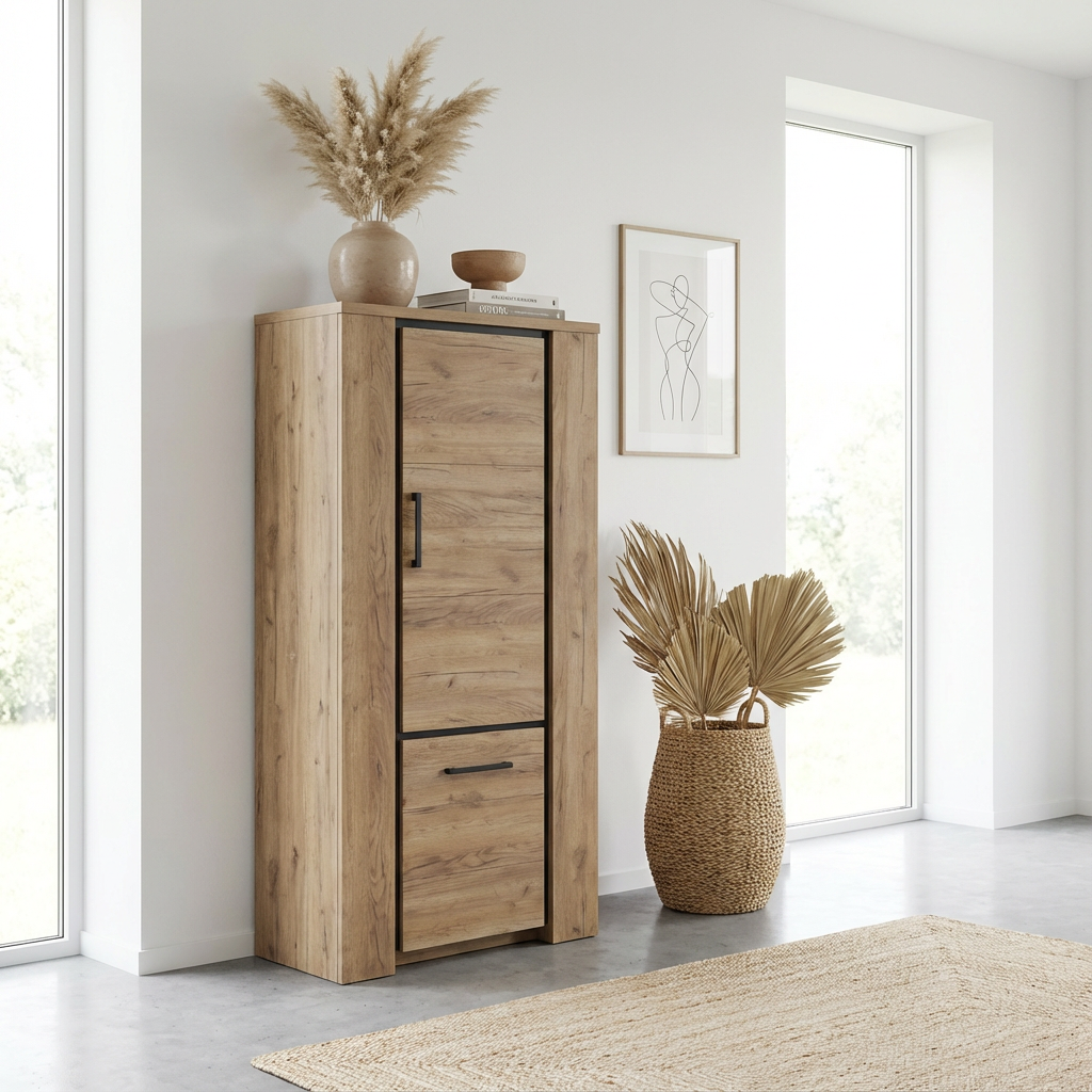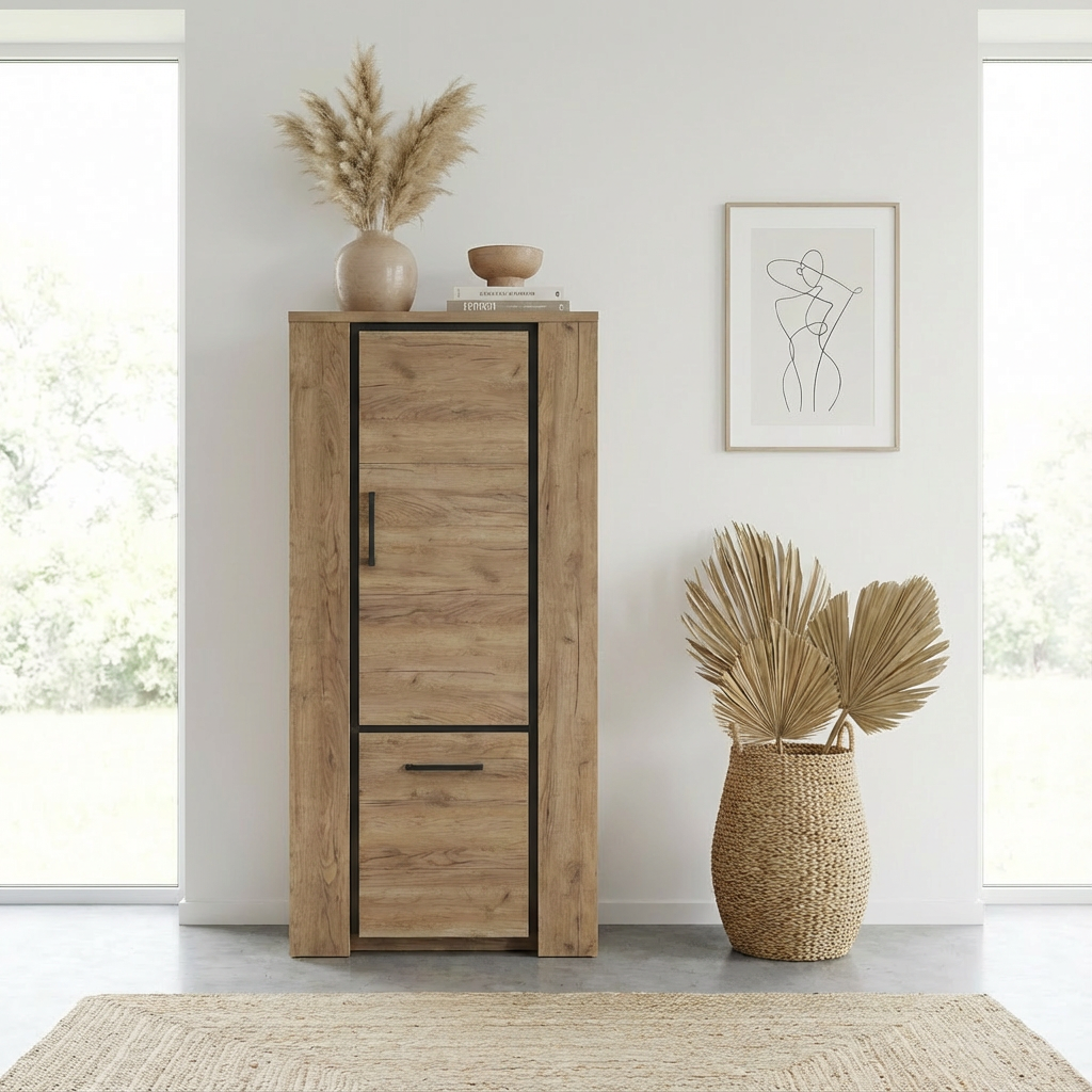 Ce meuble de rangement au style contemporain s’intègre à merveille dans tous les styles d’intérieur, grâce à ses lignes épurées et son design intemporel. Vous y trouverez deux portes battantes et quatre étagères, parfaites pour garder votre espace bien ordonné. Besoin d’un coup de pouce pour ajouter du style à votre salle à manger ou salon ? Ce meuble de rangement fera toute la différence, tout en vous simplifiant la vie avec un entretien facile : un simple coup de chiffon et un peu de savon neutre, et le tour est joué.