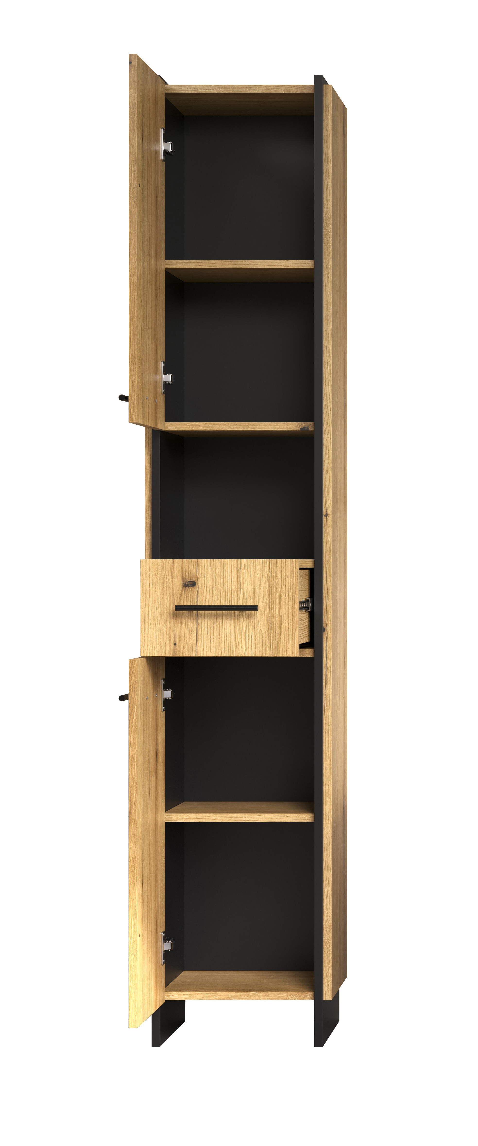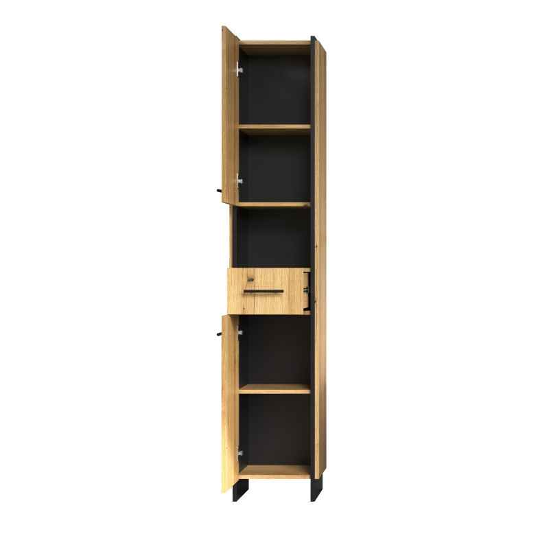 Cette colonne de salle de bain a été pensée pour maximiser votre espace de rangement grâce à une conception ingénieuse. Elle dispose de 2 portes battantes qui s'ouvrent facilement pour accéder à vos affaires, complétées par un tiroir pratique à ouverture totale permettant de visualiser et d'attraper facilement son contenu. Les 2 étagères réglables vous offrent la flexibilité d'adapter l'aménagement intérieur selon vos besoins spécifiques, que ce soit pour ranger des serviettes, des produits de beauté ou des accessoires de toilette. Son piétement en bois composite noir assure une excellente stabilité tout en créant un contraste esthétique raffiné avec le chêne clair.