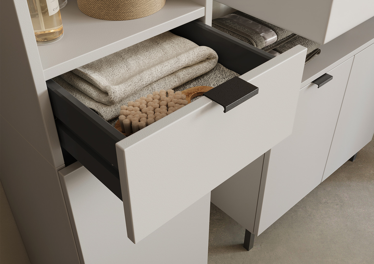 Les poignées sur les façades du meuble sont métalliques et apportent robustesse et esthétisme.
