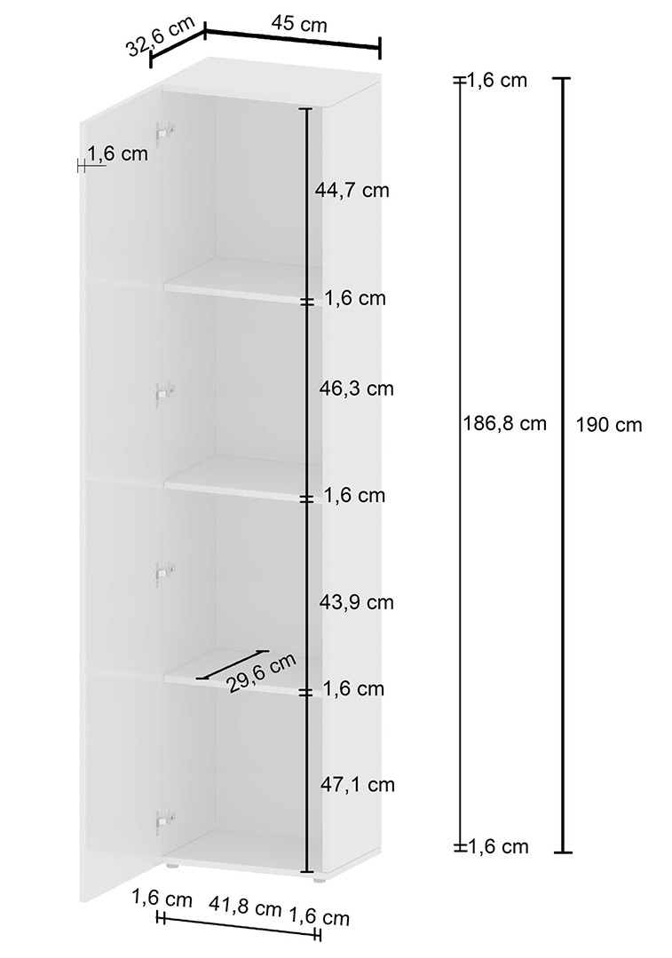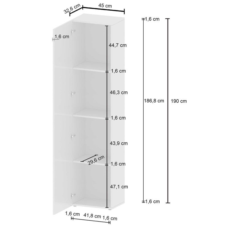 Avec ses dimensions généreuses — 190 cm de hauteur, 45 cm de largeur et 35 cm de profondeur — ce meuble de rangement offre un espace de stockage vertical optimisé, sans empiéter sur la surface au sol de votre pièce. Sa structure est constituée de panneaux de particules mélaminés de première qualité de 16 mm, garantissant robustesse et durabilité dans le temps. Le piétement en PVC assure une stabilité irréprochable, tandis que la finition mélaminée protège efficacement la surface des rayures et des taches du quotidien. Une porte battante complète l'ensemble, permettant de dissimuler vos affaires tout en facilitant l'accès.