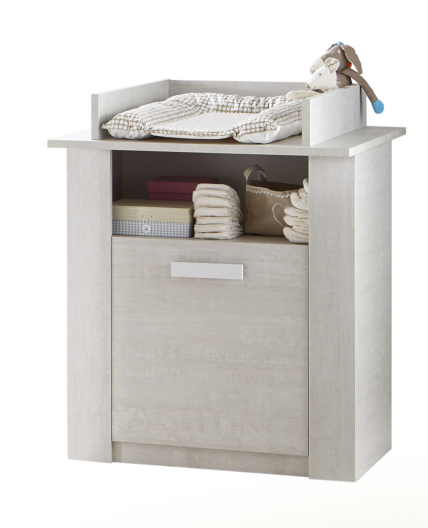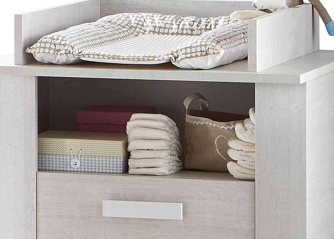 Sobre et élégante à la fois, la table à langer contemporaine Bambino conviendra aussi bien pour une chambre de fille que pour celle d'un garçon. Sa structure est fabriquée en panneaux de particules mélaminés de 15 et 22 mm d'épaisseur. Elle se compose d'un plan à langer amovible (L 50 x P 75 cm), d'une niche de rangement (L 77 x H 25 x P 48 cm) et d'une porte comprenant 1 étagère réglable sur 3 niveaux (L 55 x P 48 cm). Les poignées sont en PVC blanc. Pour un ensemble harmonieux, optez pour les autres éléments de la gamme Bambino vendus séparément.