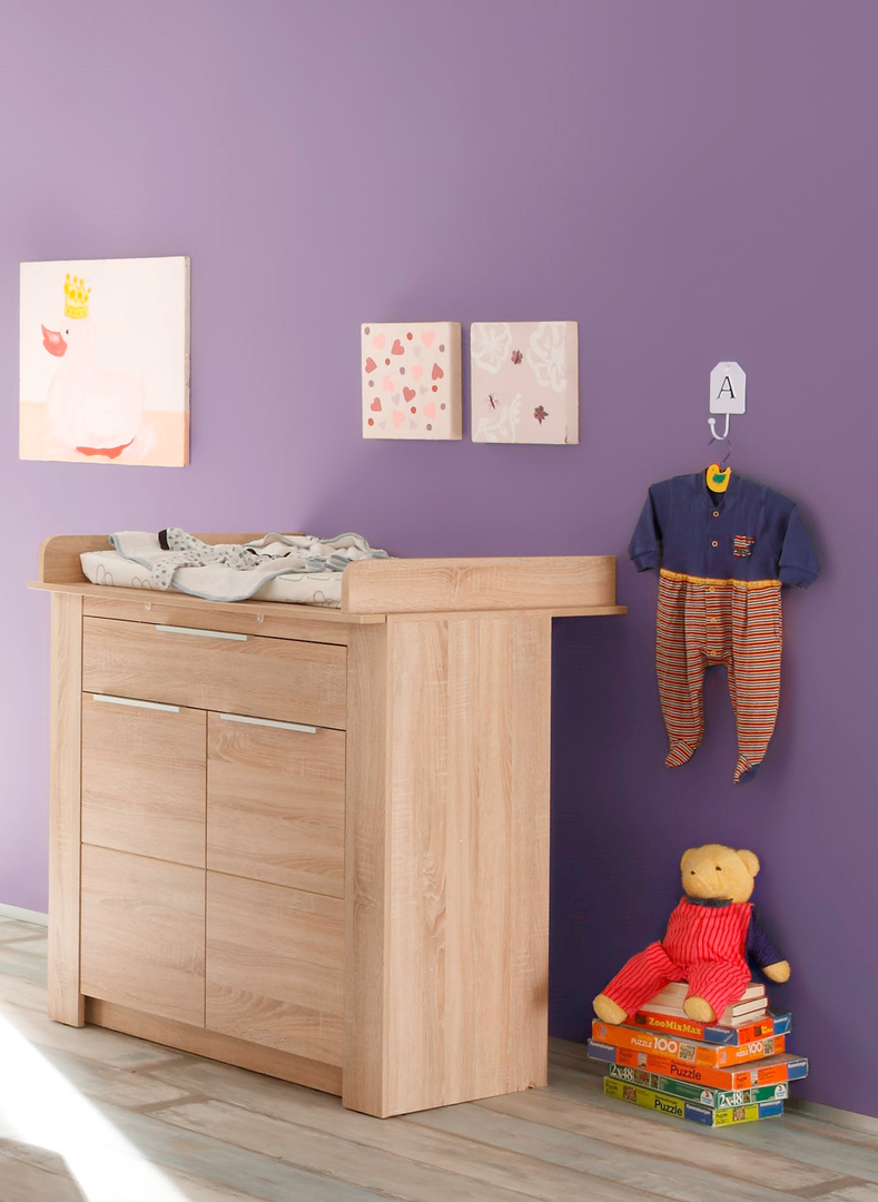 La table à langer contemporaine Charlotte apportera sobriété et apaisement dans la chambre de votre enfant grâce à son coloris chaleureux. Sa structure est fabriquée en panneaux de particules mélaminés de première qualité. Elle se compose de 2 portes, d'un tiroir monté sur coulisses métalliques et d'un plan à langer amovible pouvant supporter un poids maximal de 15 kg. Pour un ensemble harmonieux, optez pour les autres éléments de la gamme Charlotte vendus séparément.
