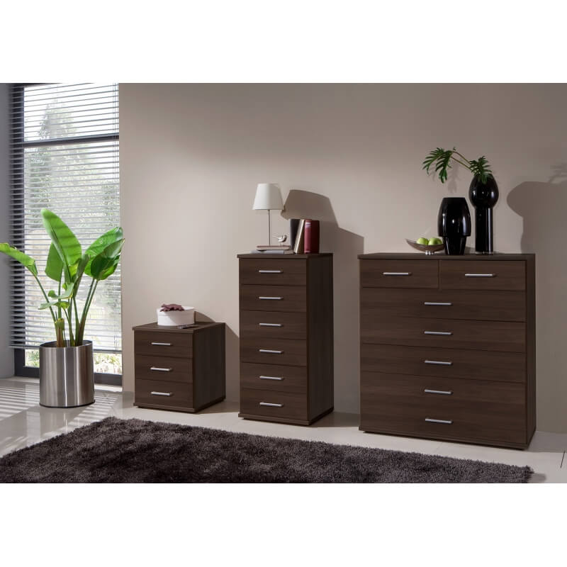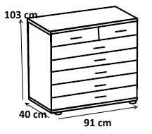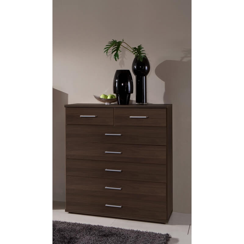La commode adulte contemporaine Siberia vous offrira un espace de rangement appréciable dans votre chambre. Sa structure est fabriquée en panneaux mélaminés de première qualité. Elle se compose de 5 grands tiroirs et 2 petits tiroirs montés sur coulisses métalliques. Pour un ensemble harmonieux, optez également pour les autres éléments de la gamme Siberia vendus séparément.