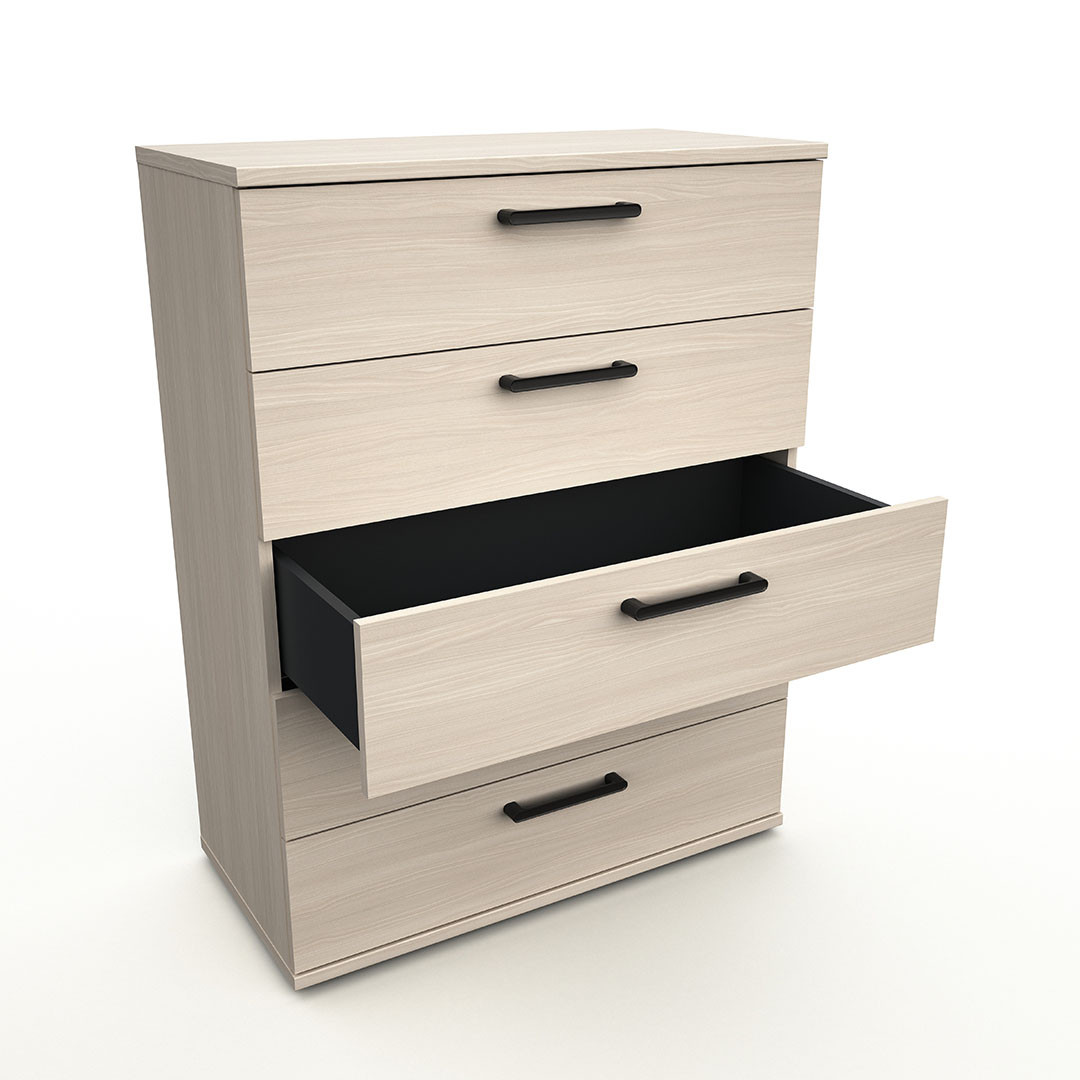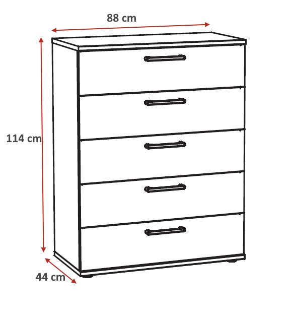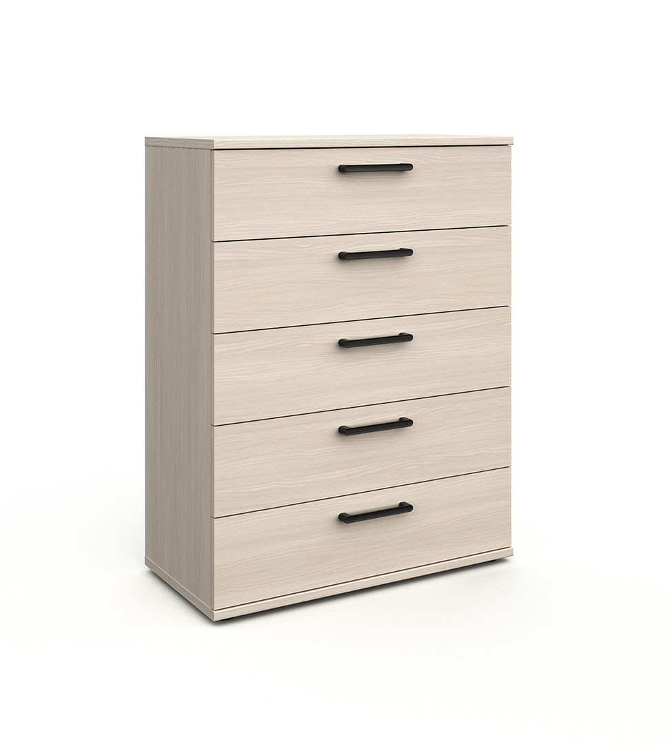 Conçue avec des panneaux de particules mélaminés de première qualité en 18, 22 et 28 mm, cette commode adulte garantit robustesse et durabilité dans le temps. Les cinq tiroirs spacieux constituent un atout majeur pour organiser efficacement vos vêtements, accessoires et effets personnels. Chaque tiroir est équipé de poignées en métal qui ajoutent une touche de raffinement tout en assurant une manipulation aisée au quotidien. Le piétement en PVC assure une excellente stabilité tout en protégeant vos sols des rayures, tandis que la finition mélaminée offre une surface résistante aux chocs et facile à entretenir d'un simple coup de chiffon doux et humide.