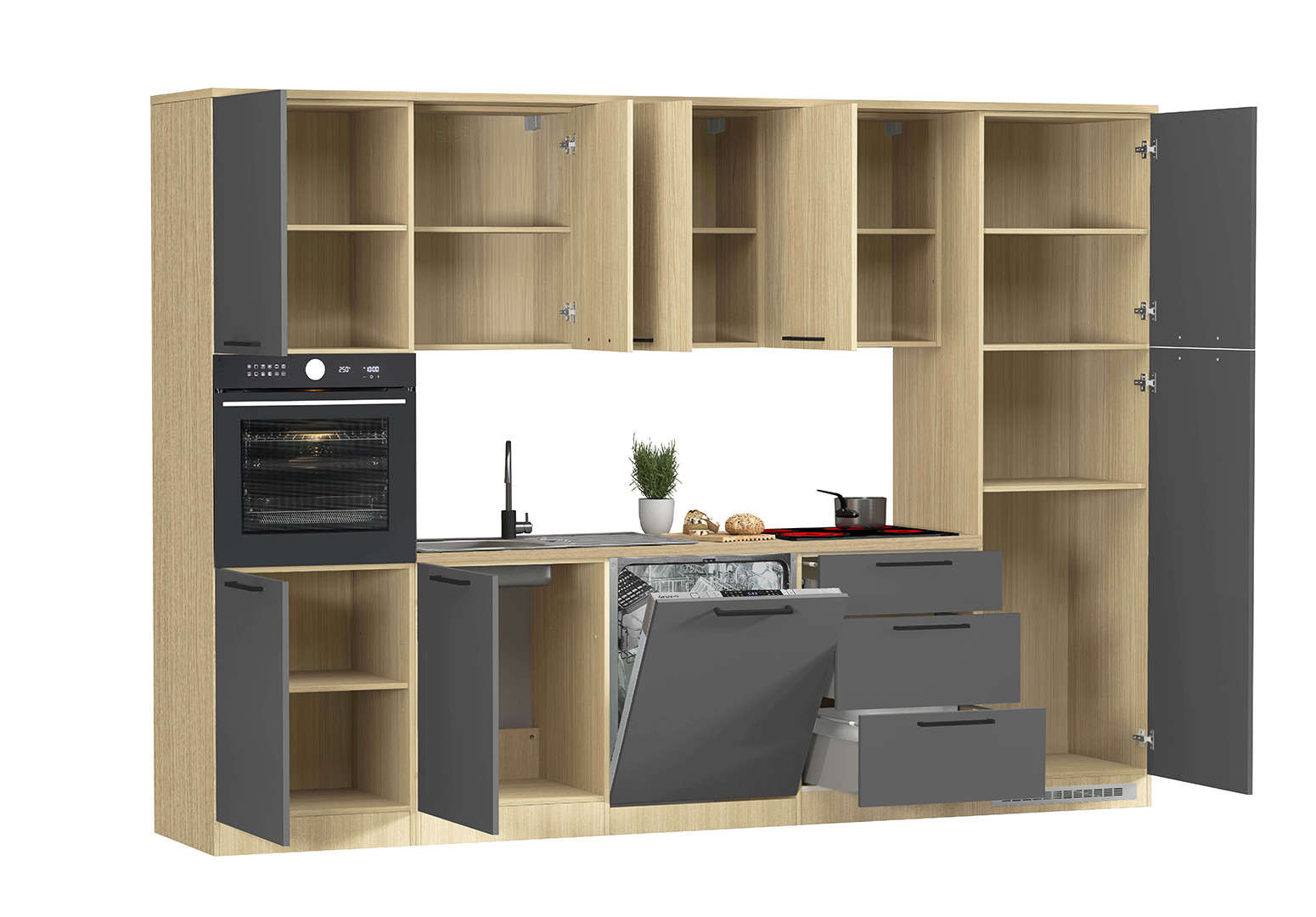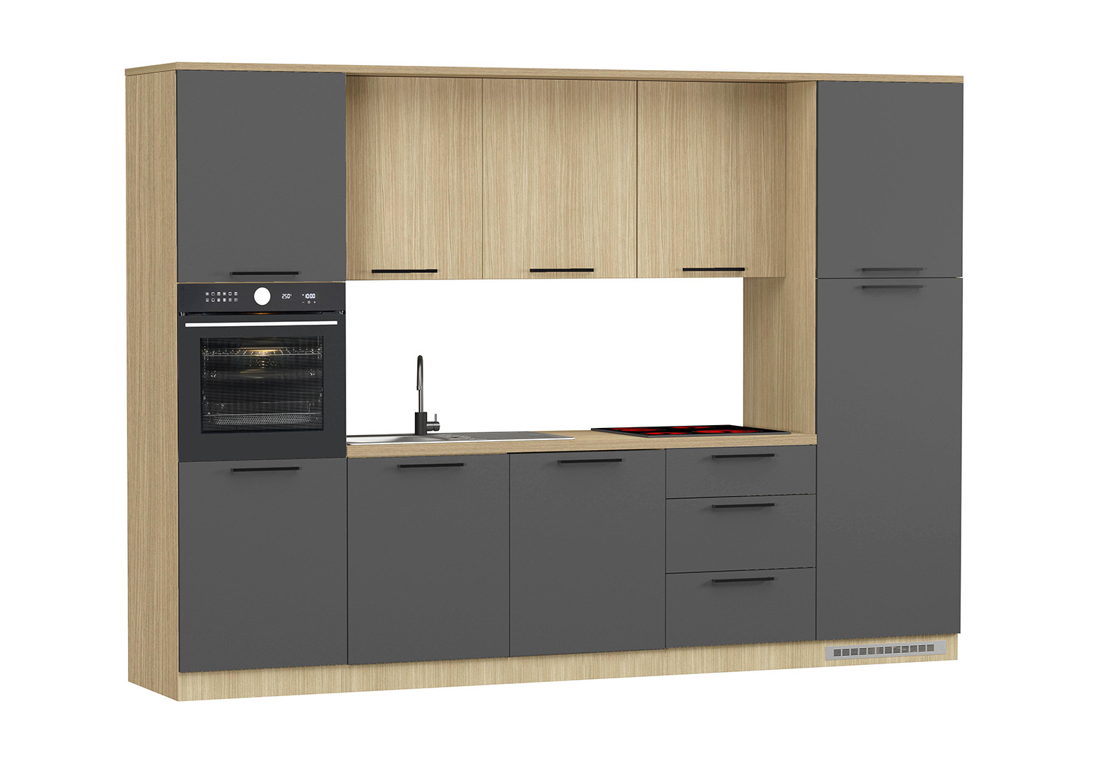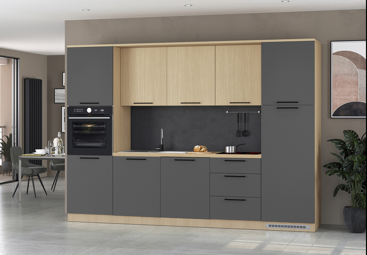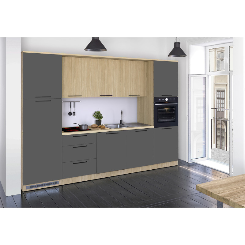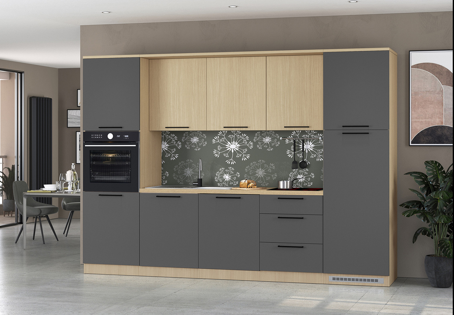 Imaginez un espace de vie où chaque détail a été pensé pour allier esthétique contemporaine et fonctionnalité au quotidien. Cette cuisine complète de 300 cm signée Deladeco incarne parfaitement cette vision, avec son coloris anthracite mat associé à des accents chêne chaleureux qui créent un contraste saisissant. Fabriquée en Italie avec le soin et la précision qui caractérisent l'artisanat transalpin, elle s'impose naturellement comme la pièce maîtresse d'un intérieur moderne et raffiné, capable de transformer votre espace de cuisson en véritable lieu de vie.