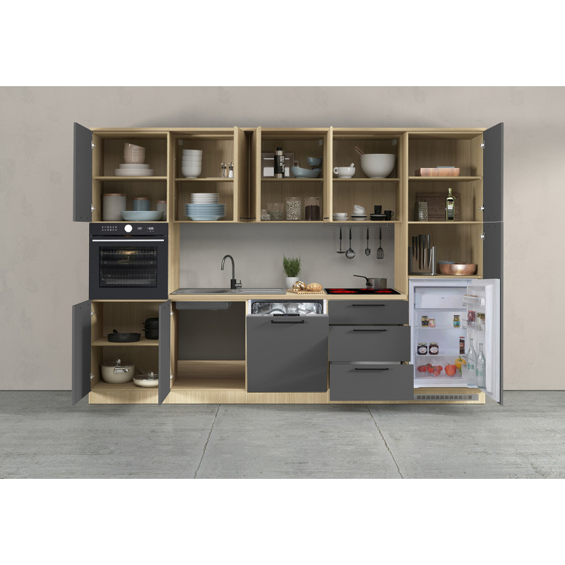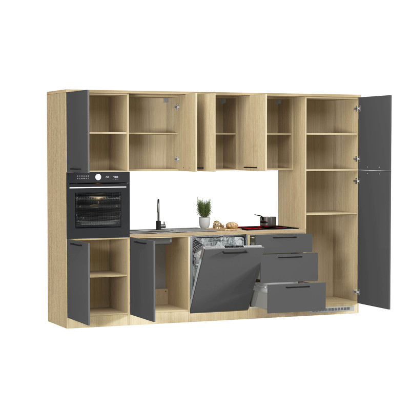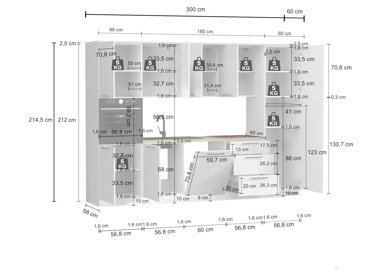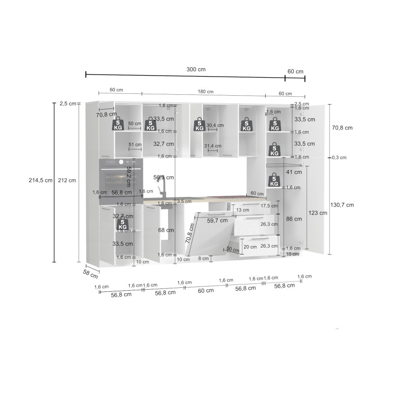 Avec ses dimensions généreuses de 300 cm de longueur, 215 cm de hauteur et 58 cm de profondeur, ces meubles de cuisine offrent une capacité de rangement optimale pour accueillir vaisselle, ustensiles et provisions en toute organisation. Les portes battantes à finition mélaminée s'ouvrent avec fluidité et facilitent l'accès à chaque compartiment. Pour compléter votre aménagement, vous pouvez explorer une large sélection de meuble de cuisine afin de personnaliser votre projet selon vos besoins et votre espace disponible.