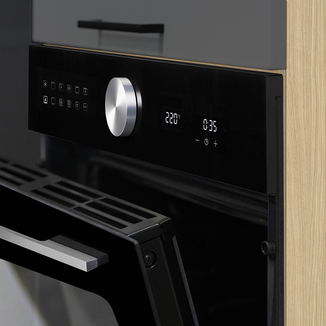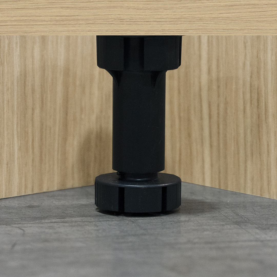 La robustesse est au cœur de cette cuisine grâce à une structure conçue avec des panneaux de particules mélaminés de première qualité, disponibles en épaisseurs de 16, 25 et 35 mm selon les éléments. Les chants ABS assurent une finition soignée et une résistance accrue aux chocs du quotidien, tandis que les poignées en aluminium apportent cette touche résolument contemporaine qui fait toute la différence. Le piétement en PVC garantit stabilité et durabilité dans le temps, même dans un environnement soumis à l'humidité et aux variations de température propres à une pièce cuisine.