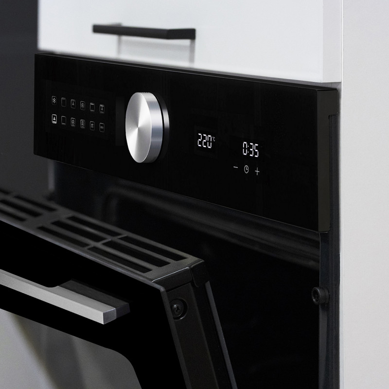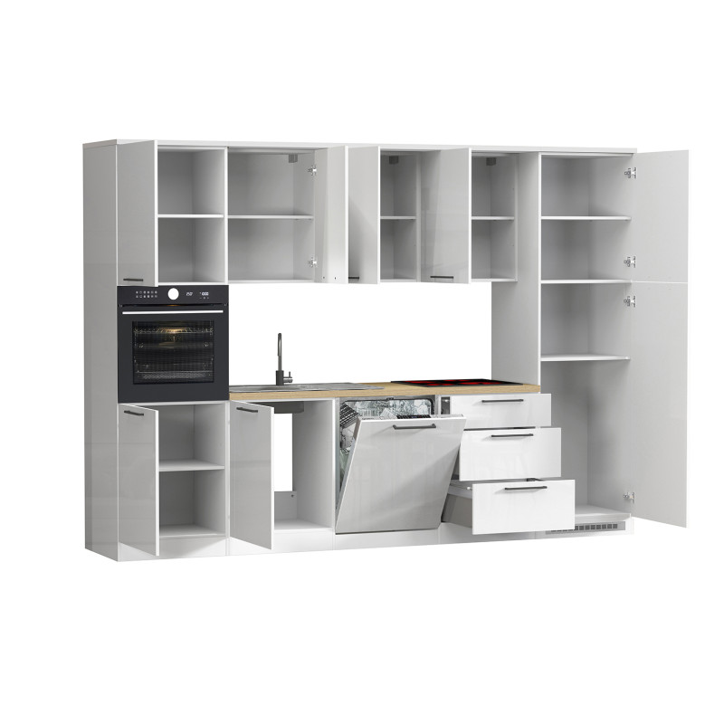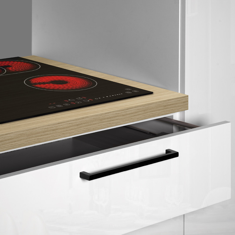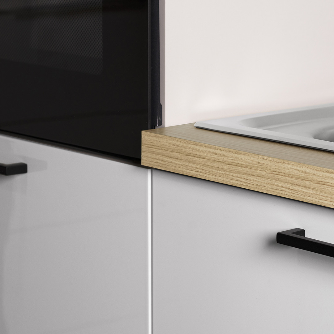 Le coloris blanc brillant associé aux accents chêne confère à cette cuisine une atmosphère chaleureuse et résolument moderne, parfaite pour s'intégrer dans tout type d'intérieur. Fabriquée en Italie avec un savoir-faire reconnu, elle est constituée de panneaux de particules mélaminés de première qualité, disponibles en épaisseurs de 16, 25 et 35 mm selon les zones de structure. Les corps sont traités en blanc mat tandis que les façades arborent un blanc brillant séduisant, le tout rehaussé de chants ABS soigneusement appliqués pour une finition irréprochable. Les élégantes poignées en aluminium apportent une touche contemporaine supplémentaire.
