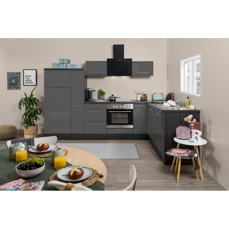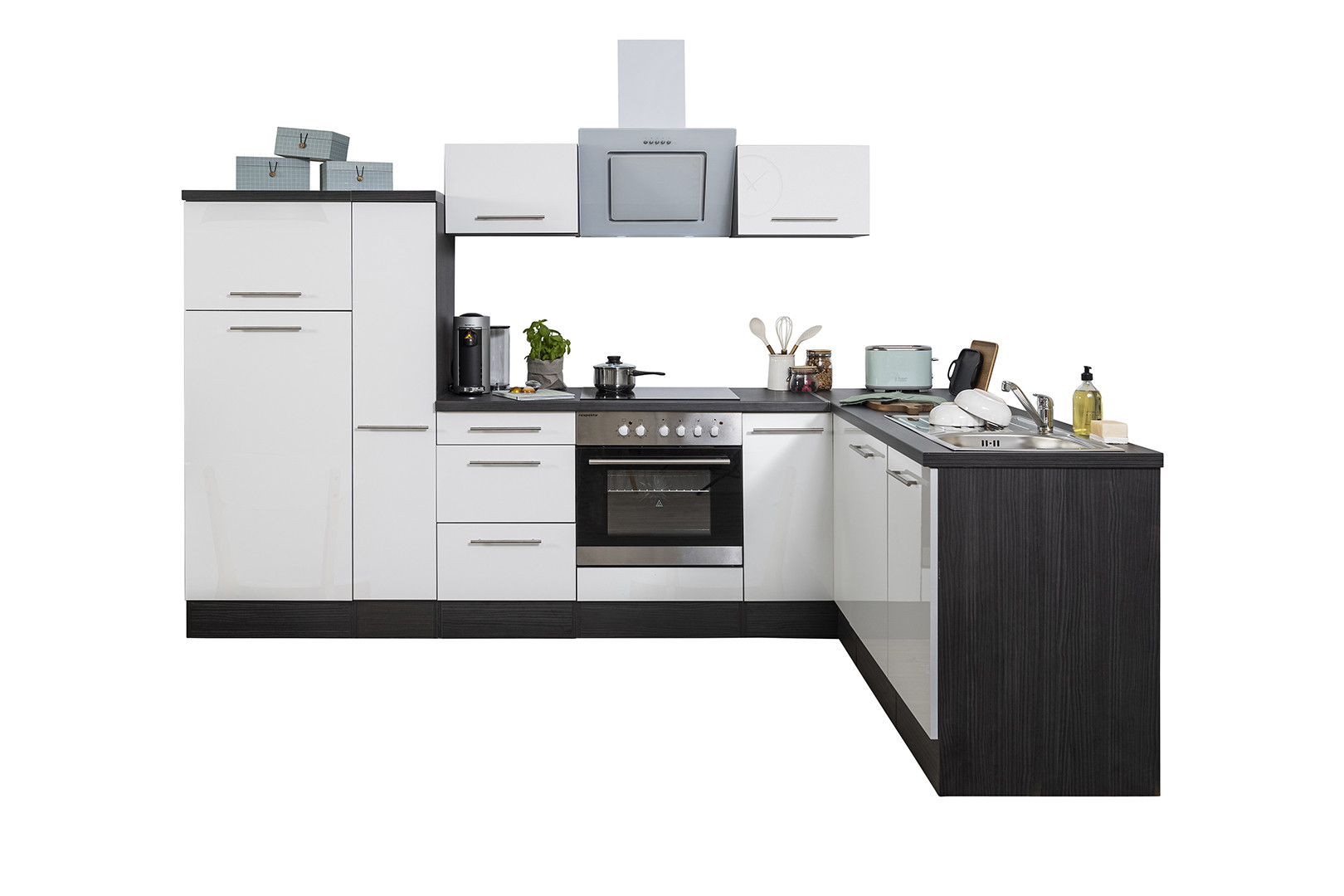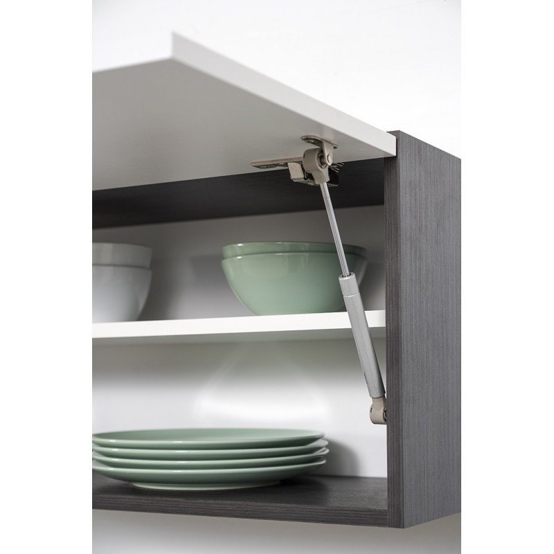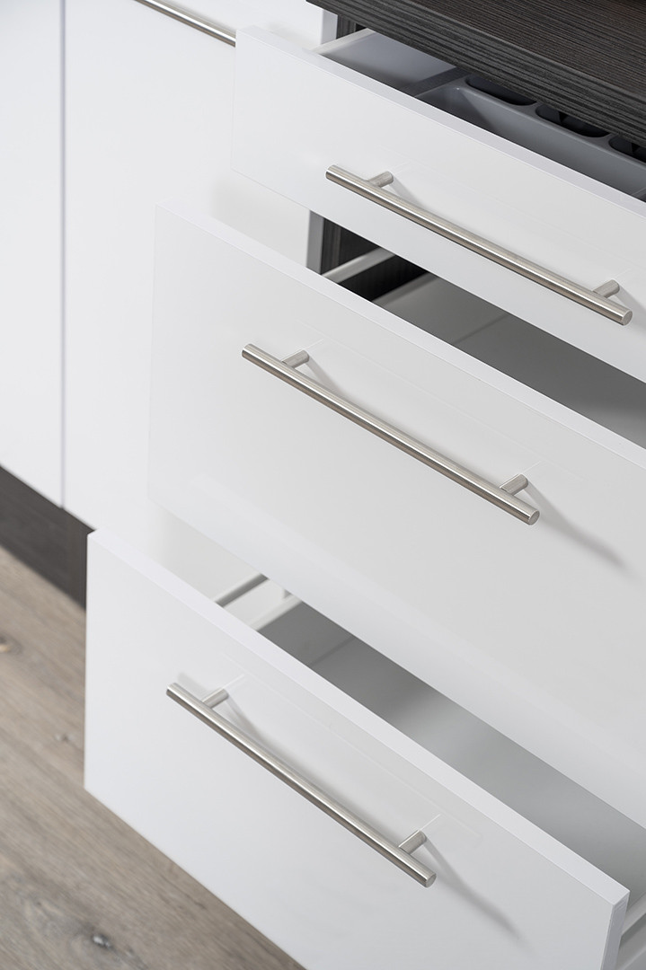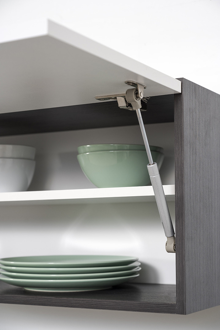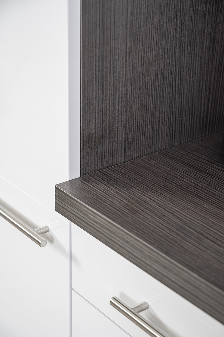 | Structure | Corps des meubles en panneaux de particules mélaminés 16 mm - façades brillantes en MDF 19 mm - plan de travail 38 mm (avec plan de découpe) - poignées en métal aspect acier inoxydable |