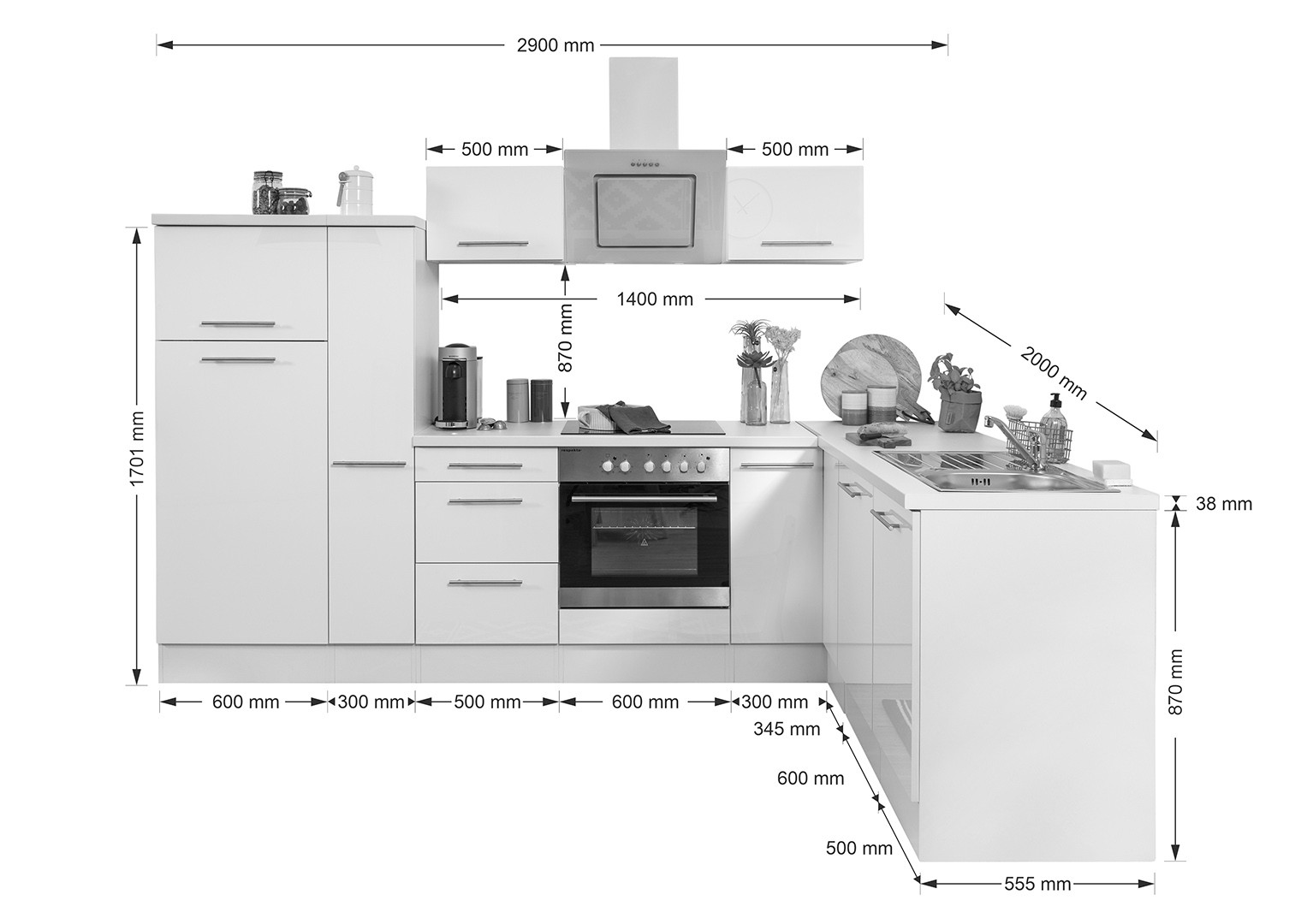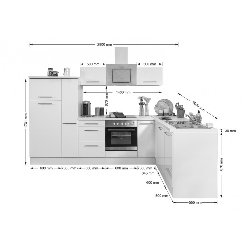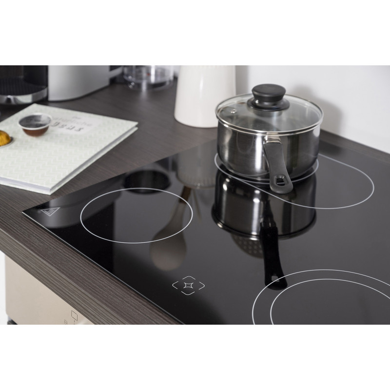 | Information complémentaire | Inclus : réfrigérateur/congélateur, four encastrable, hotte inclinée en acier inoxydable, table de cuisson vitrocéramique, lave-vaisselle et évier inox (raccord, flexible et bonde inclus) |