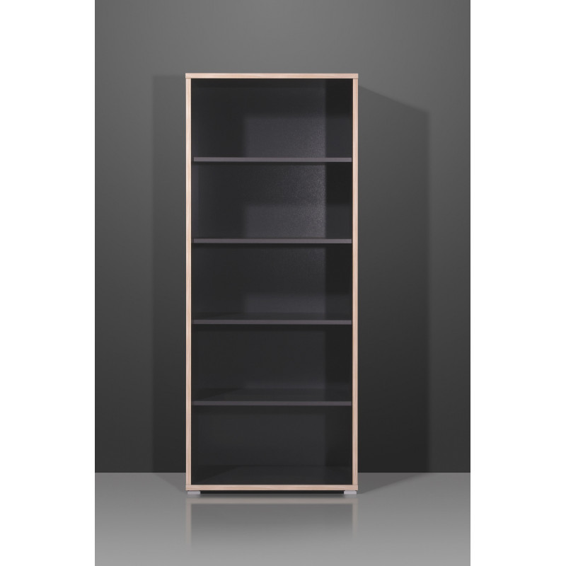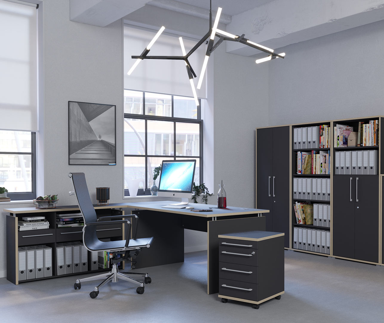 L'ensemble de bureau contemporain Garland se compose de cinq éléments : un bureau d'angle, un caisson sur roulettes, une armoire haute, une étagère haute et une armoire combinée.