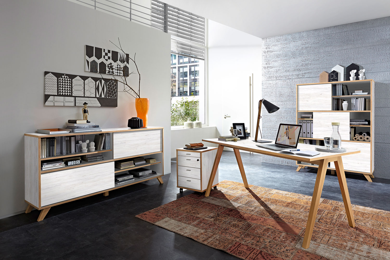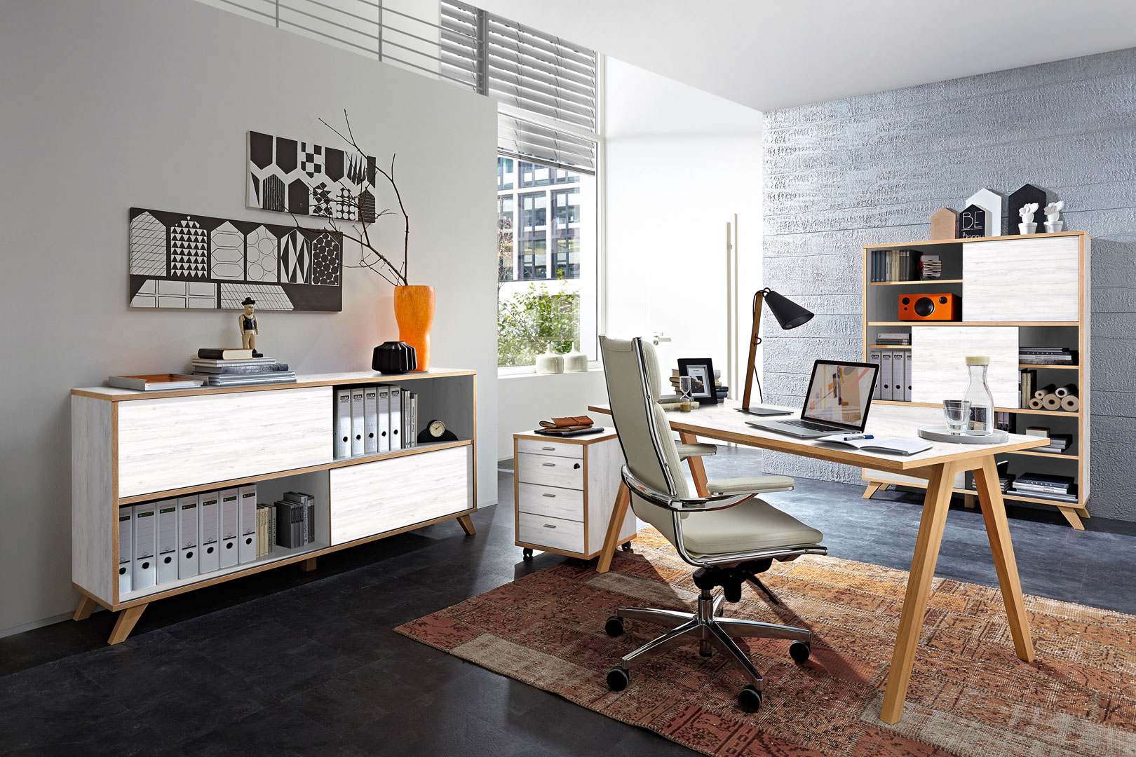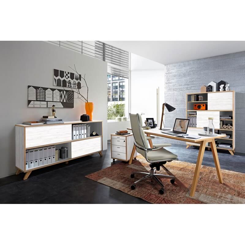 L'ensemble de bureau contemporain Marco vous séduira par son style scandinave et le mélange original de ses coloris. Sa structure est fabriquée en panneaux de particules mélaminés de première qualité. IL se compose de 4 éléments : deux armoires de bureau à portes coulissantes, un bureau et un caisson de bureau. Les tiroirs sont montés sur coulisses métalliques. Pour un ensemble harmonieux, optez également pour les autres éléments de la gamme Marco vendus séparément.