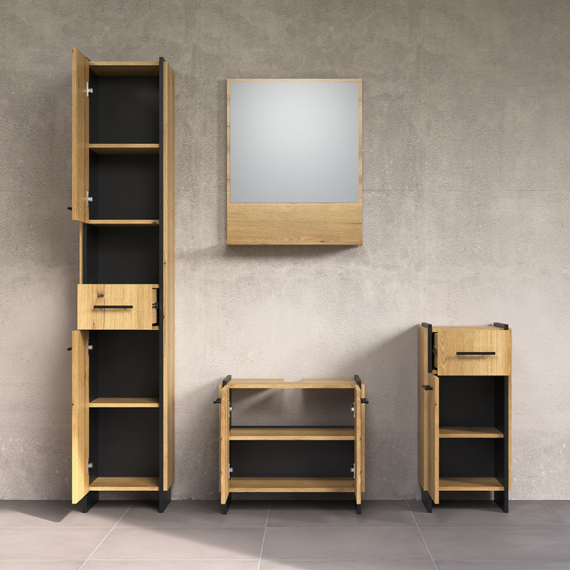 La qualité de fabrication constitue l'un des atouts majeurs de cet meuble de salle de bain Saphira. Réalisé en panneaux de particules mélaminés de haute qualité, l'ensemble bénéficie d'une finition mélanine résistante à l'humidité et aux projections d'eau, garantissant ainsi une durabilité optimale dans l'environnement spécifique d'une salle de bain. Les poignées en métal et le piétement en bois composite noir ajoutent une touche d'élégance tout en assurant une solidité à toute épreuve. Les portes battantes s'ouvrent facilement, tandis que les tiroirs disposent d'un système d'ouverture totale permettant un accès aisé à l'intégralité de leur contenu. Cette conception intelligente maximise l'espace de rangement disponible et facilite l'organisation de vos produits et accessoires du quotidien.