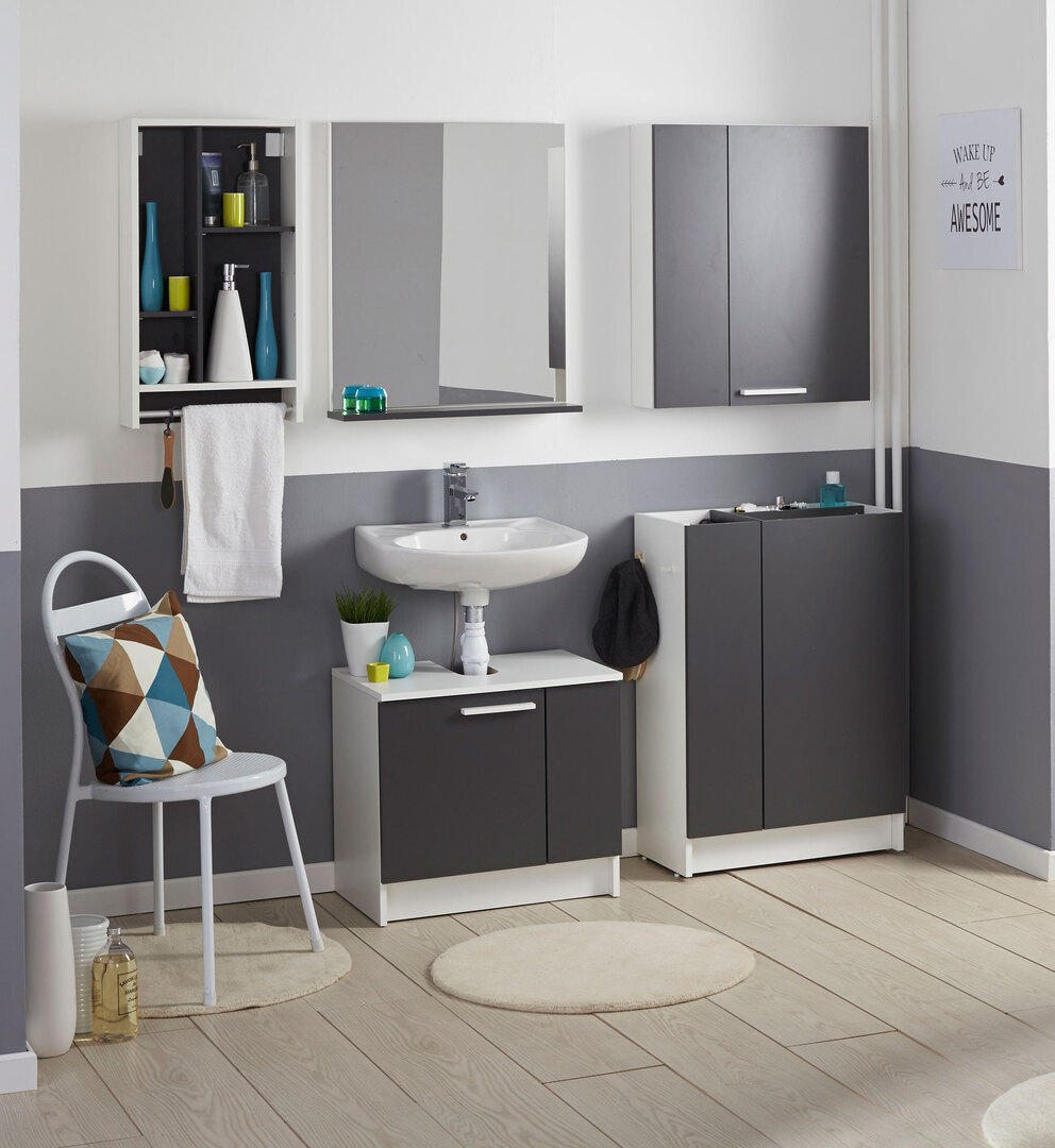 L'ensemble de salle de bain contemporain Angelus apportera une touche originale dans votre salle de bain grâce à son coloris bi-ton. Sa structure est fabriquée en panneaux de particules mélaminés de première qualité. L'arrière des meubles est en panneaux de fibres coloris blanc de 2,5 mm d'épaisseur. Il se compose de 5 éléments : une étagère murale, un miroir, un meuble bas, un meuble sous-lavabo et un meuble haut. Pour un ensemble harmonieux, optez également pour les autres éléments de la gamme Angelus vendus séparément.