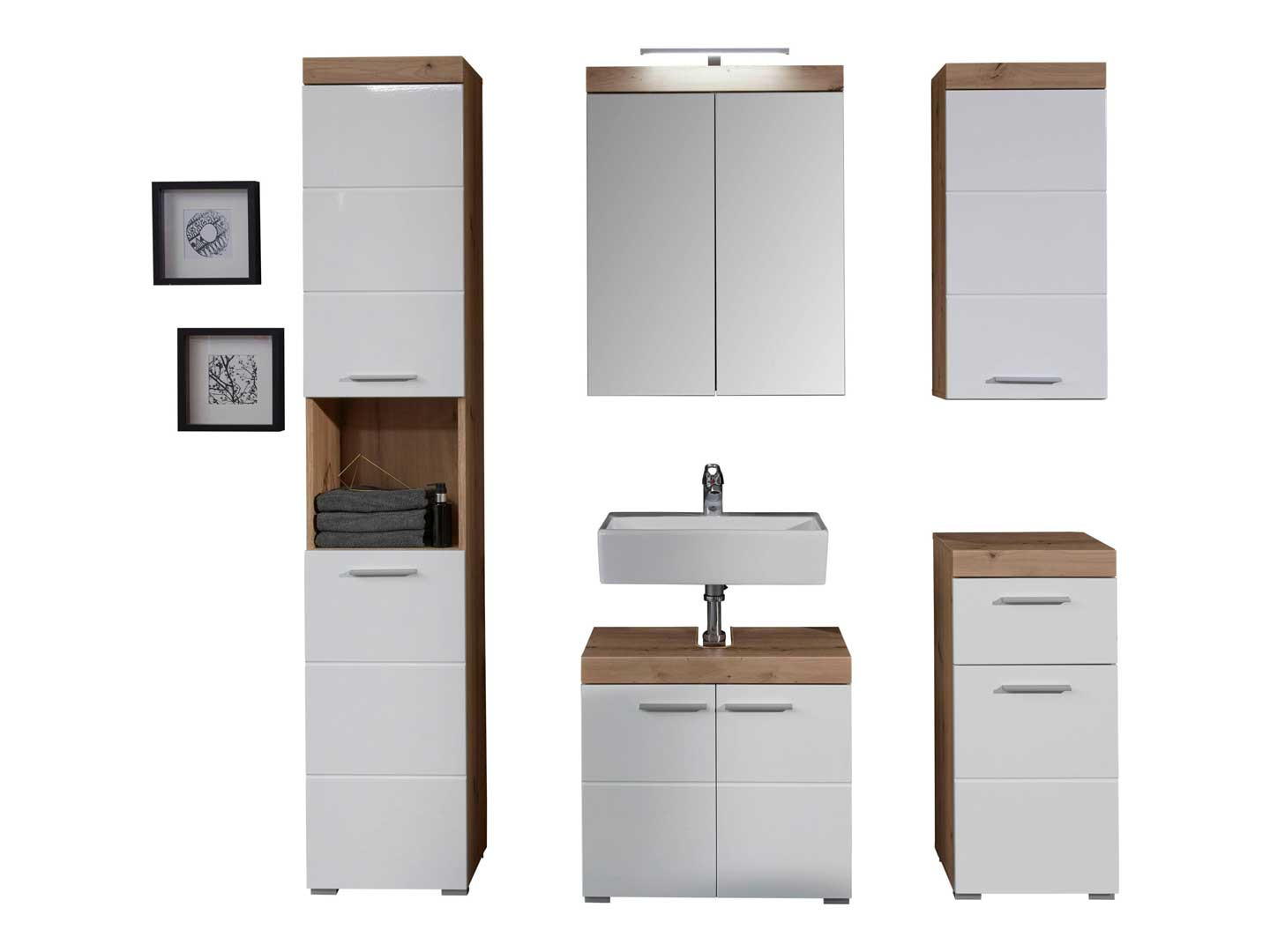 Il se compose de cinq éléments : une colonne, un meuble sous vasque, une armoire de toilette avec éclairage Led, un meuble bas et un meuble haut.