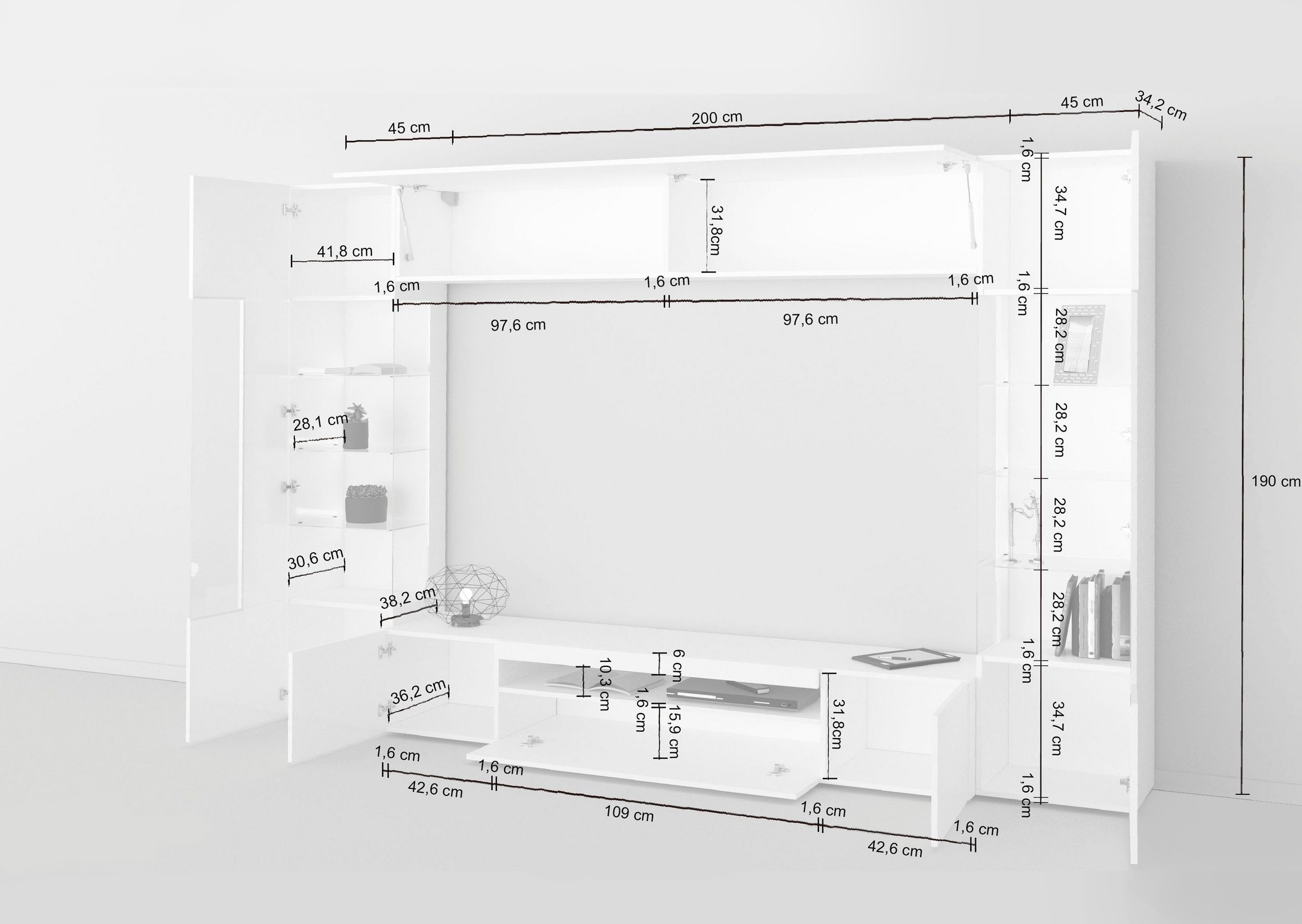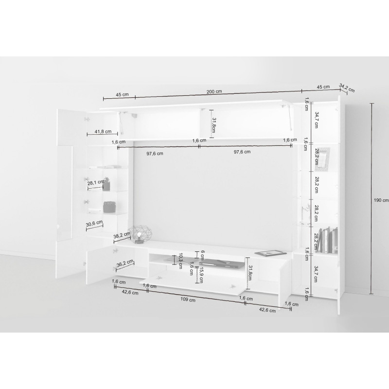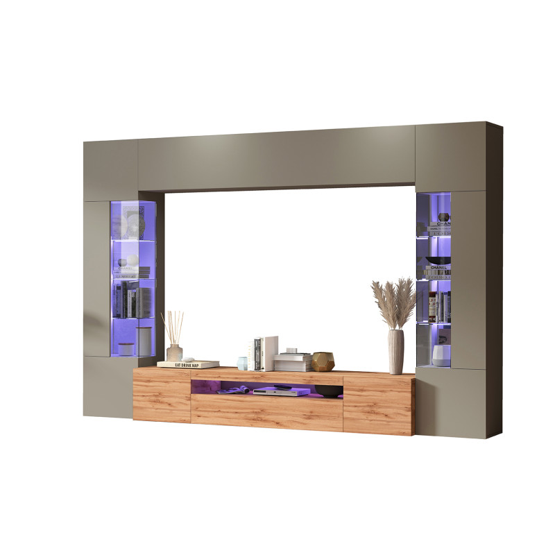 Avec une longueur de 290 cm, une hauteur de 190 cm et une profondeur de 40 cm, ce meuble offre un espace de rangement généreux tout en optimisant l’organisation de votre espace salon. Ses portes battantes à système d’ouverture par charnières métalliques assurent une manipulation fluide et résistante. Que ce soit pour exposer vos objets décoratifs ou ranger vos équipements multimédia, cet ensemble TV répond à toutes les attentes fonctionnelles. L’option d’éclairage LED, disponible en blanc ou en bleu, ajoute une ambiance lumineuse agréable et personnalisable selon vos préférences, soulignant encore plus le style contemporain de ces meubles TV.
