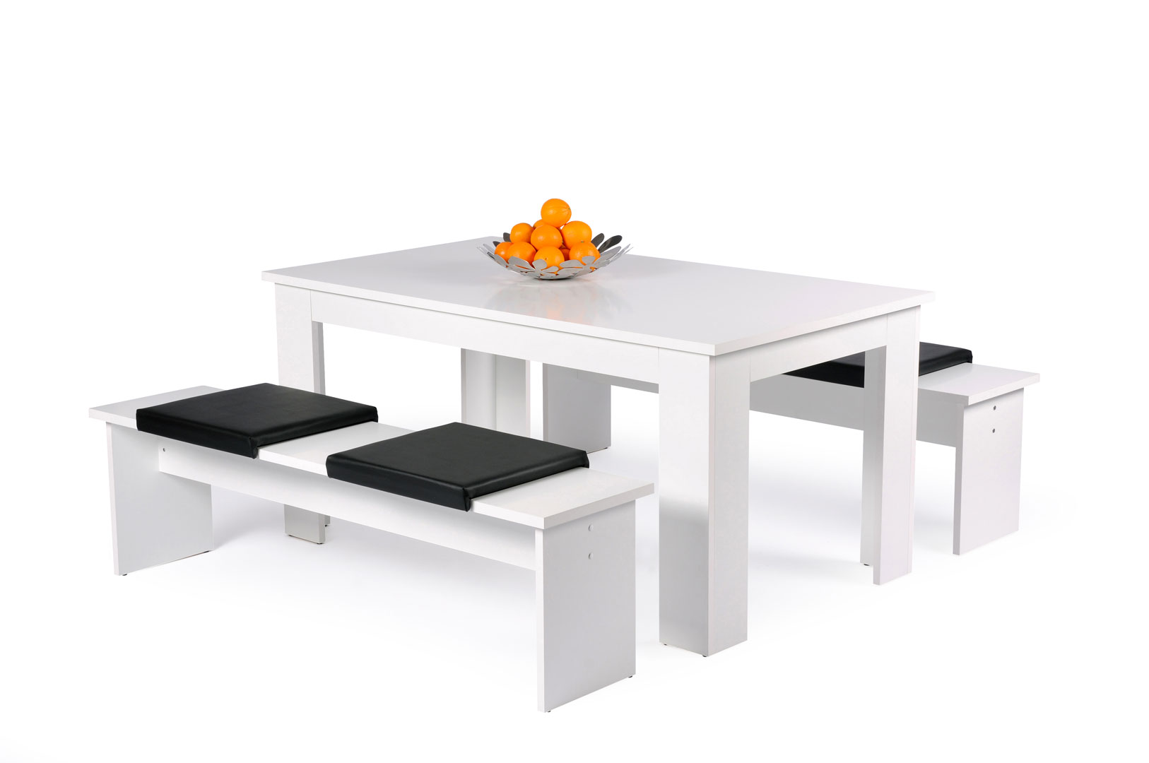 L'ensemble Loriane apportera une touche moderne et raffinée dans votre intérieur grâce à ses lignes épurées et son coloris tendance. Sa structure est fabriquée en panneaux de particules mélaminés. Il se compose d'une table rectangulaire disponible en deux dimensions : 140 ou 160 cm et de deux bancs dotés de coussins d'assise coloris noir.