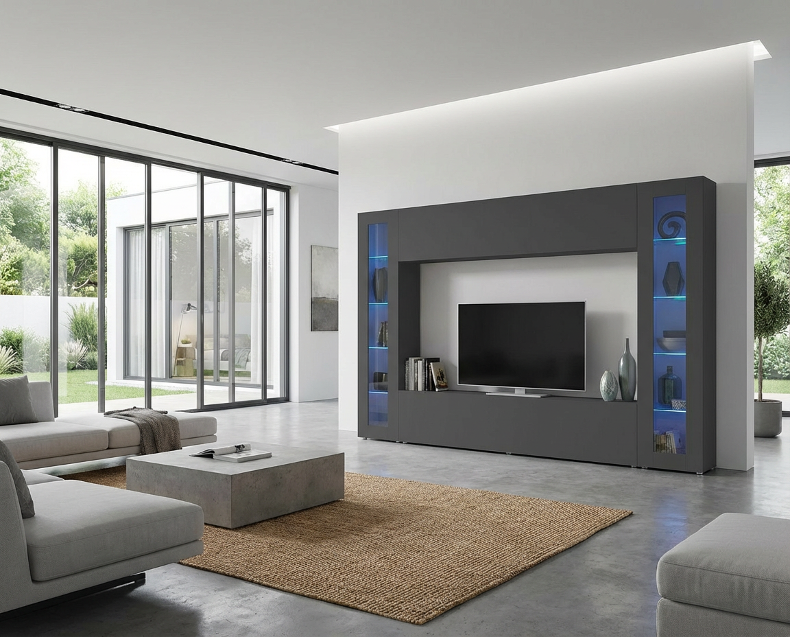 Vous cherchez à moderniser votre salon avec une touche élégante et pratique ? L'ensemble TV mural Maroussia est exactement ce qu'il vous faut ! Avec son design épuré et ses lignes contemporaines, il s'intègre parfaitement dans les intérieurs modernes. Fabriqué en Italie par la marque Deladeco, cet ensemble impressionne par ses dimensions généreuses – 260 cm de long, 180 cm de haut et 30 cm de profondeur – qui habillent avec style n'importe quel espace. Sa structure robuste en panneaux de particules mélaminés de haute qualité, combinée à une finition anthracite mat ultra tendance, fait de ce meuble un choix à la fois chic et durable.