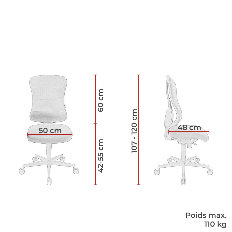Le fauteuil de bureau professionnel Sinchrone est doté d'un revêtement en tissu 100% Trevira CS, garantissant résistance et facilité d'entretien. Les accoudoirs "TW1", réglables en hauteur, ajoutent une touche d'ergonomie supplémentaire pour réduire la fatigue lors des longues heures de travail. La hauteur totale du fauteuil est réglable de 107 à 120 cm, et la profondeur de l'assise est de 48 cm, offrant ainsi une personnalisation maximale de votre poste de travail.