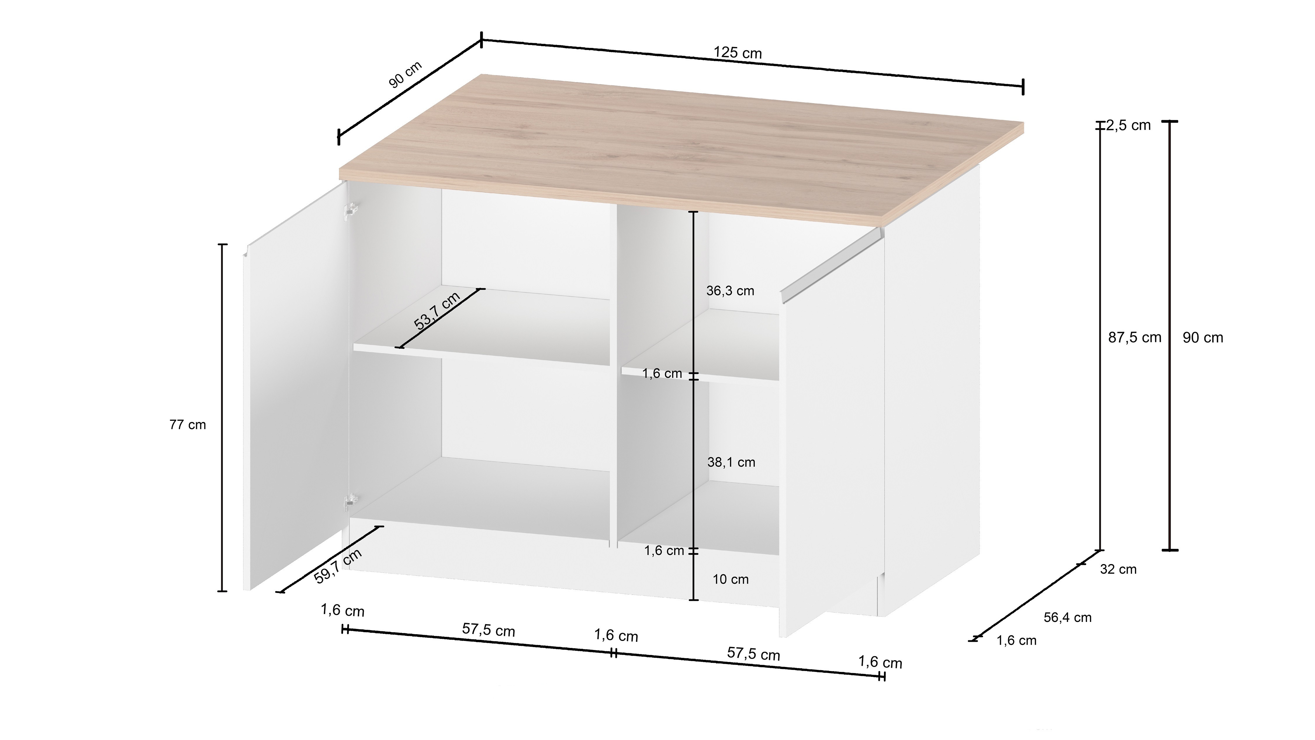 Fabriqué en panneaux de particules mélaminés de première qualité, ce meuble affiche une grande robustesse. Son plateau de 25 mm avec chants ABS et ses poignées en aluminium encastrées témoignent du soin apporté aux détails. Il dispose de deux portes battantes avec système d’ouverture Soft Close, garantissant un confort d’utilisation au quotidien. Plus qu’un simple plan de travail, il peut aussi être utilisé comme billot de cuisine, offrant une surface stable pour couper, trancher ou poser vos ustensiles, tout en étant facile à entretenir avec un simple chiffon doux et humide.