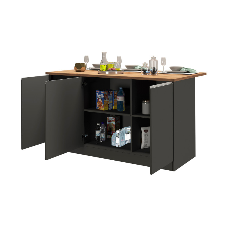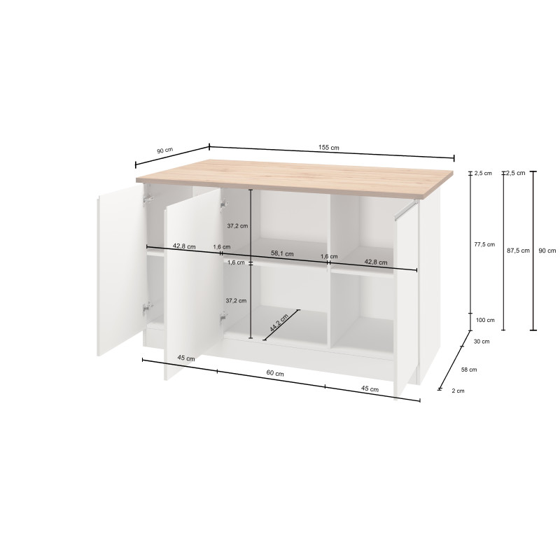 Sa structure robuste en panneaux de particules mélaminés de première qualité (16 mm d’épaisseur et plateau de 25 mm avec chants ABS) garantit solidité et durabilité. Les poignées en aluminium encastrées renforcent l’esthétique moderne et épurée du meuble. Doté de trois portes battantes à système d'ouverture Soft Close, il offre un confort d'utilisation au quotidien et une excellente capacité de rangement, en véritable meuble de rangement. Ce modèle est idéal pour garder à portée de main ustensiles, vaisselle ou épicerie.