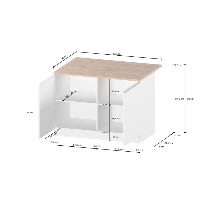 Avec sa hauteur de 90 cm et sa profondeur équivalente à sa longueur (90 x 125 cm), il offre une surface idéale pour cuisiner, poser vos ustensiles ou même prendre un repas sur le pouce. Il peut parfaitement compléter un meuble de cuisine existant ou s'intégrer dans une nouvelle conception de cuisine ouverte. C’est aussi une excellente alternative au traditionnel billot, avec un design plus spacieux et résolument moderne.