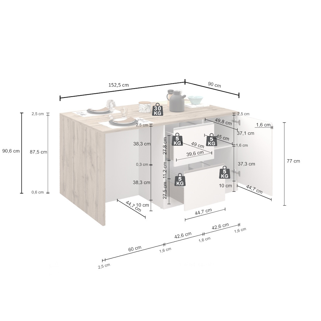 Côté structure, cet îlot de cuisine repose sur des panneaux de particules mélaminés de première qualité en 16 et 25 mm, garantissant une robustesse à toute épreuve au quotidien. Le plateau épais de 25 mm offre une surface de travail généreuse et solide, idéale aussi bien pour préparer vos repas que pour installer un coin petit-déjeuner convivial. Ses dimensions généreuses — 153 cm de longueur pour 90 cm de hauteur et 90 cm de profondeur — en font un véritable poste de travail central dans votre cuisine. À la manière d'un billot de cuisine traditionnel revisité, il allie fonctionnalité et esthétique moderne.
