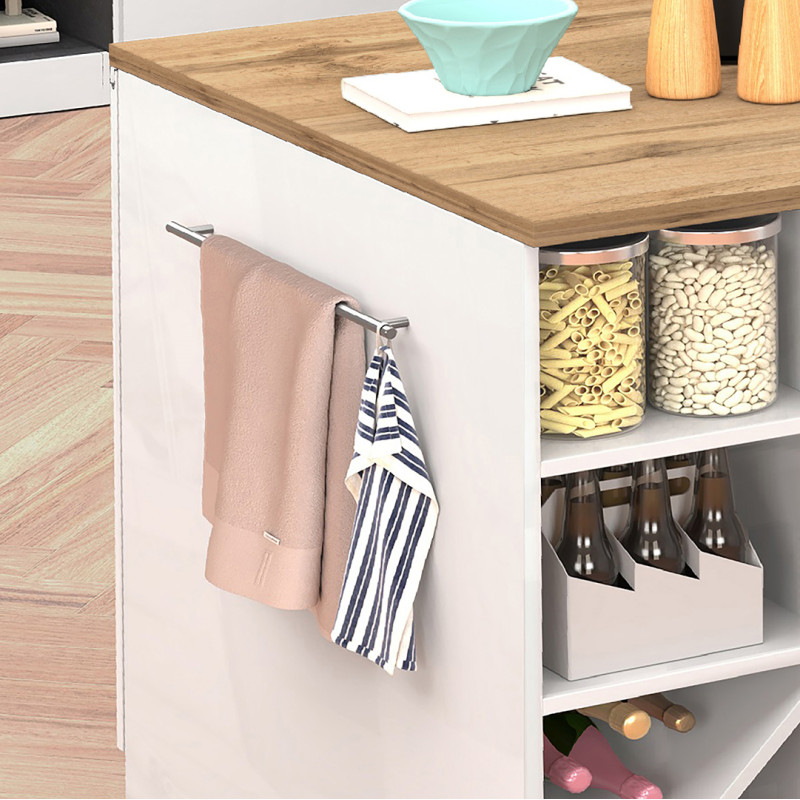 Côté rangement, cet îlot de cuisine moderne dispose d'une porte battante et de deux tiroirs équipés d'un système Soft Close, garantissant une fermeture silencieuse et en douceur. Les poignées en aluminium apportent une touche industrielle raffinée, tandis que le plateau d'une épaisseur de 25 mm assure solidité et confort lors de chaque utilisation. Sa structure à corps blanc mat et ses façades blanc brillant créent un jeu de matières subtil qui habille la pièce avec élégance. Pratique et polyvalent, cet îlot peut également faire office de billot pour la découpe, grâce à sa surface de travail spacieuse et stable.