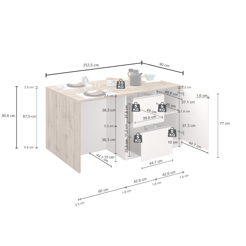 Pensé pour les cuisines ouvertes et les intérieurs modernes, cet îlot de cuisine central signé Deladeco allie esthétisme soigné et fonctionnalité au quotidien. Fabriqué en Italie avec des panneaux de particules mélaminés de première qualité (16 et 25 mm), il affiche une robustesse à toute épreuve tout en conservant une silhouette élégante. Ses dimensions généreuses — 153 cm de longueur, 90 cm de hauteur et 90 cm de profondeur — en font un véritable centre névralgique de votre cuisine, idéal pour préparer vos repas, recevoir vos proches ou organiser votre espace avec style. Sa finition blanc brillant associée aux accents chêne wotan lui confère un caractère bicolore contemporain qui s'adapte aussi bien aux intérieurs épurés qu'aux décors chaleureux.