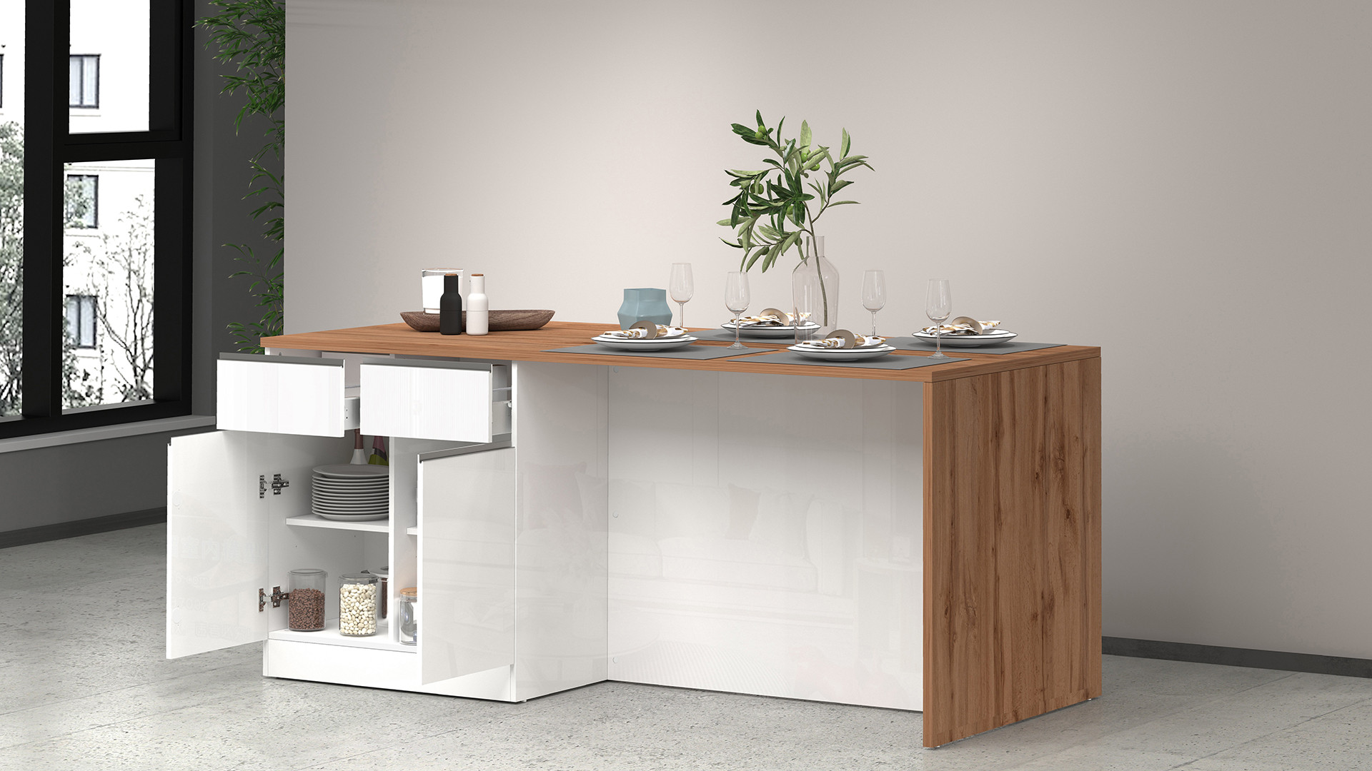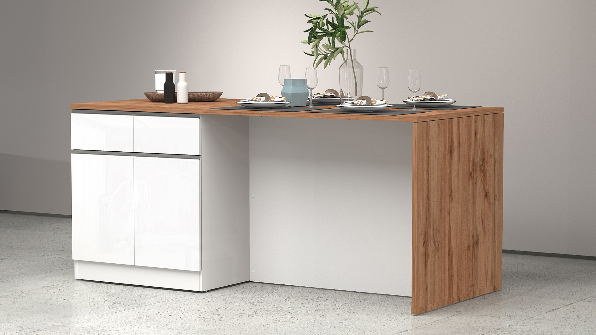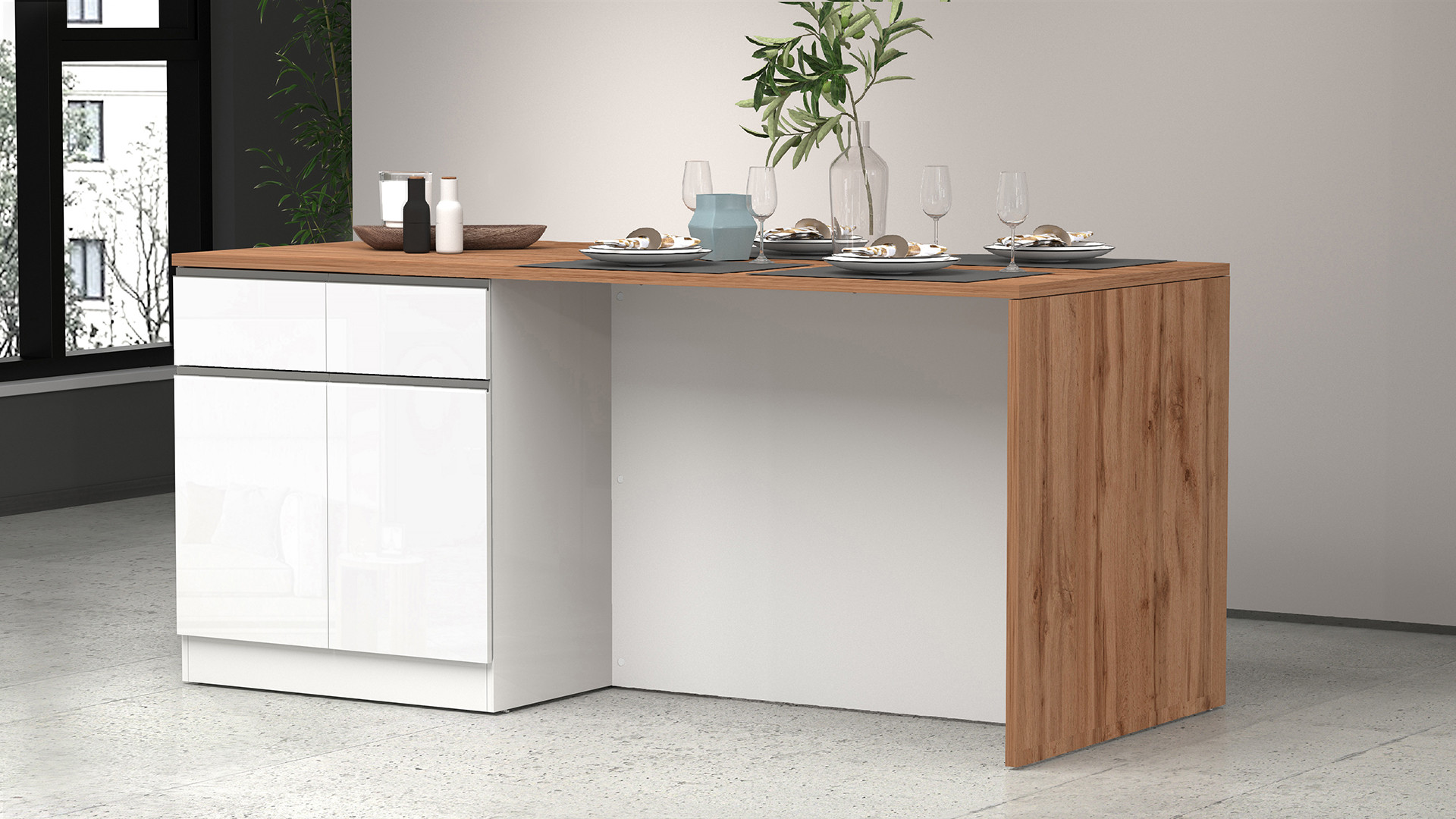 | Îlot de cuisine moderne 4 portes blanc brillant/chêne wotan Solena | | Longueur: 200 cm Hauteur: 90 cm Profondeur: 90 cm | En stock 48 à 72h | 659 € 99 | ||