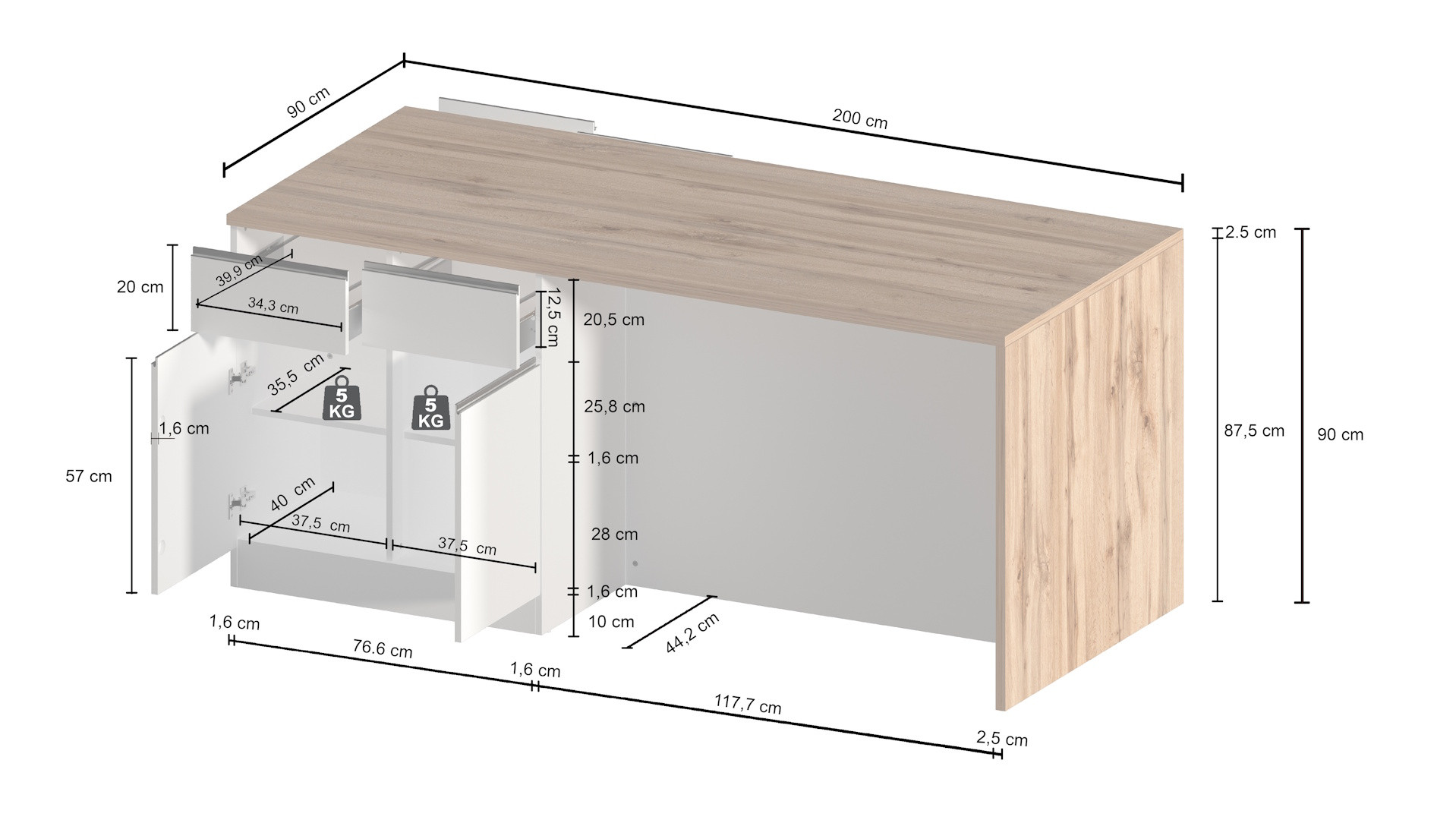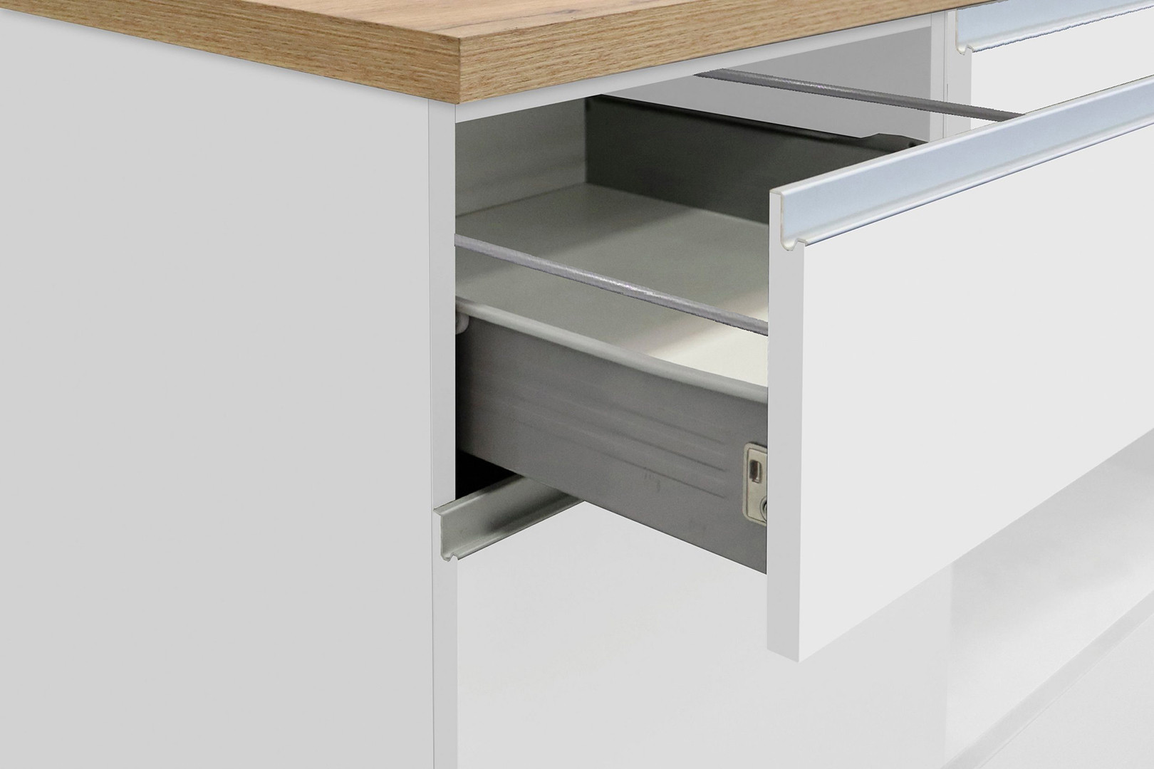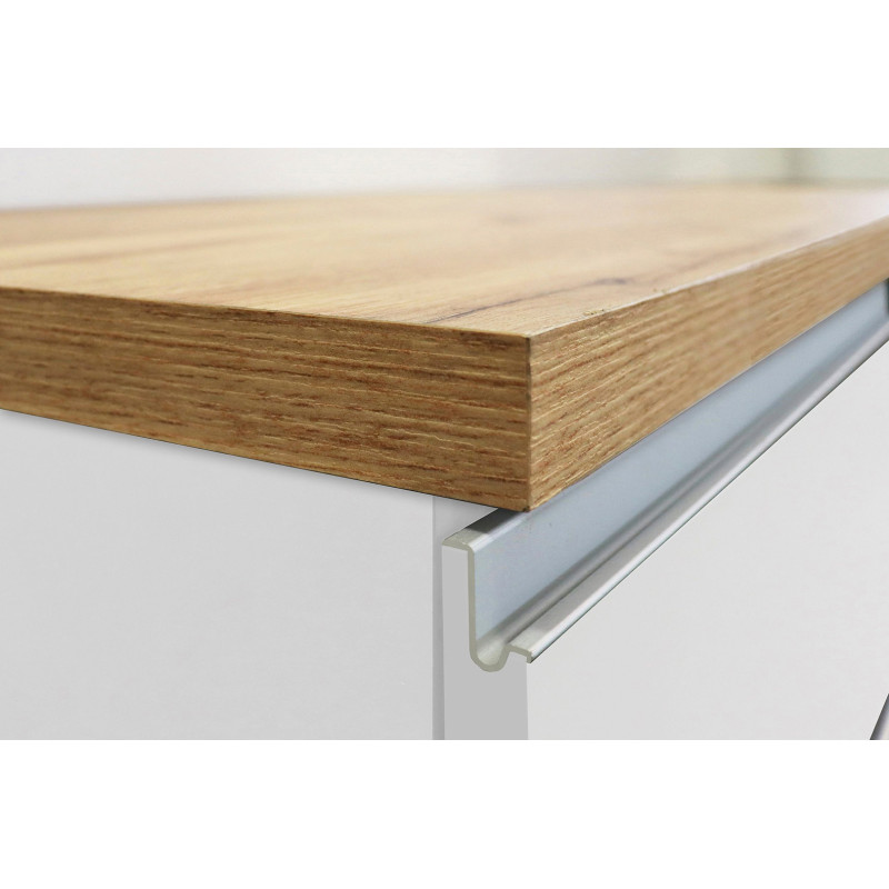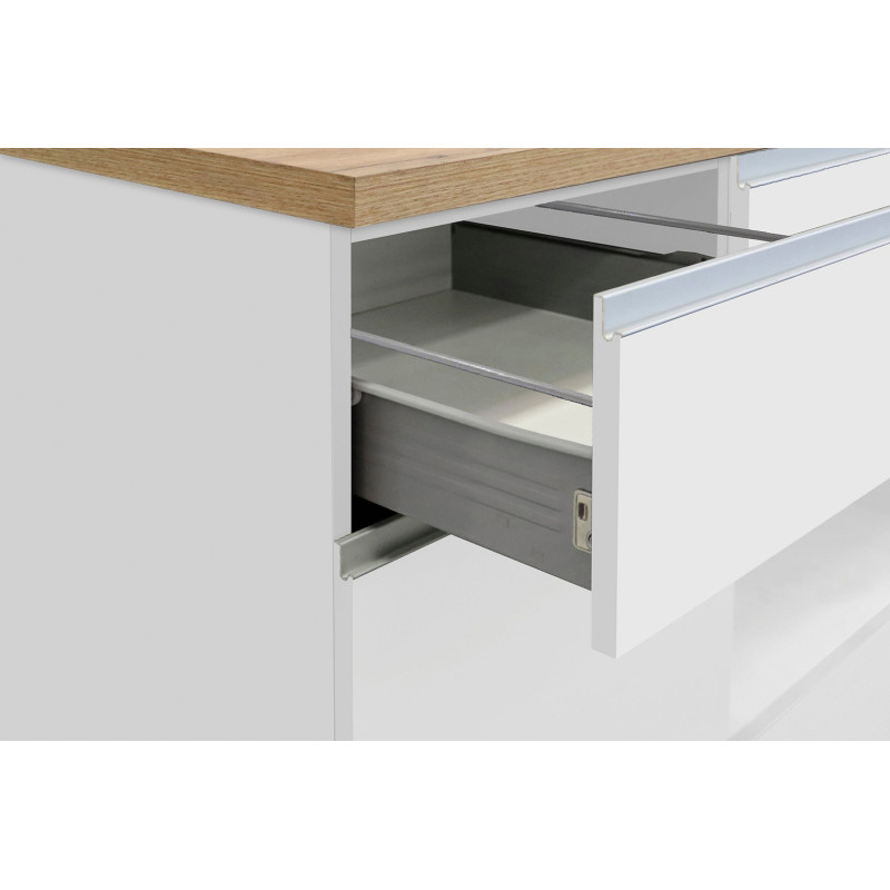 | Structure | Panneaux de particules mélaminés de première qualité 16 et 25 mm - façades blanc brillant - corps blanc mat - poignées en aluminium |