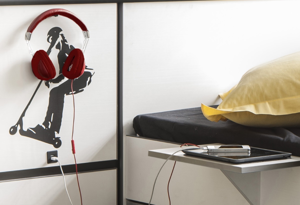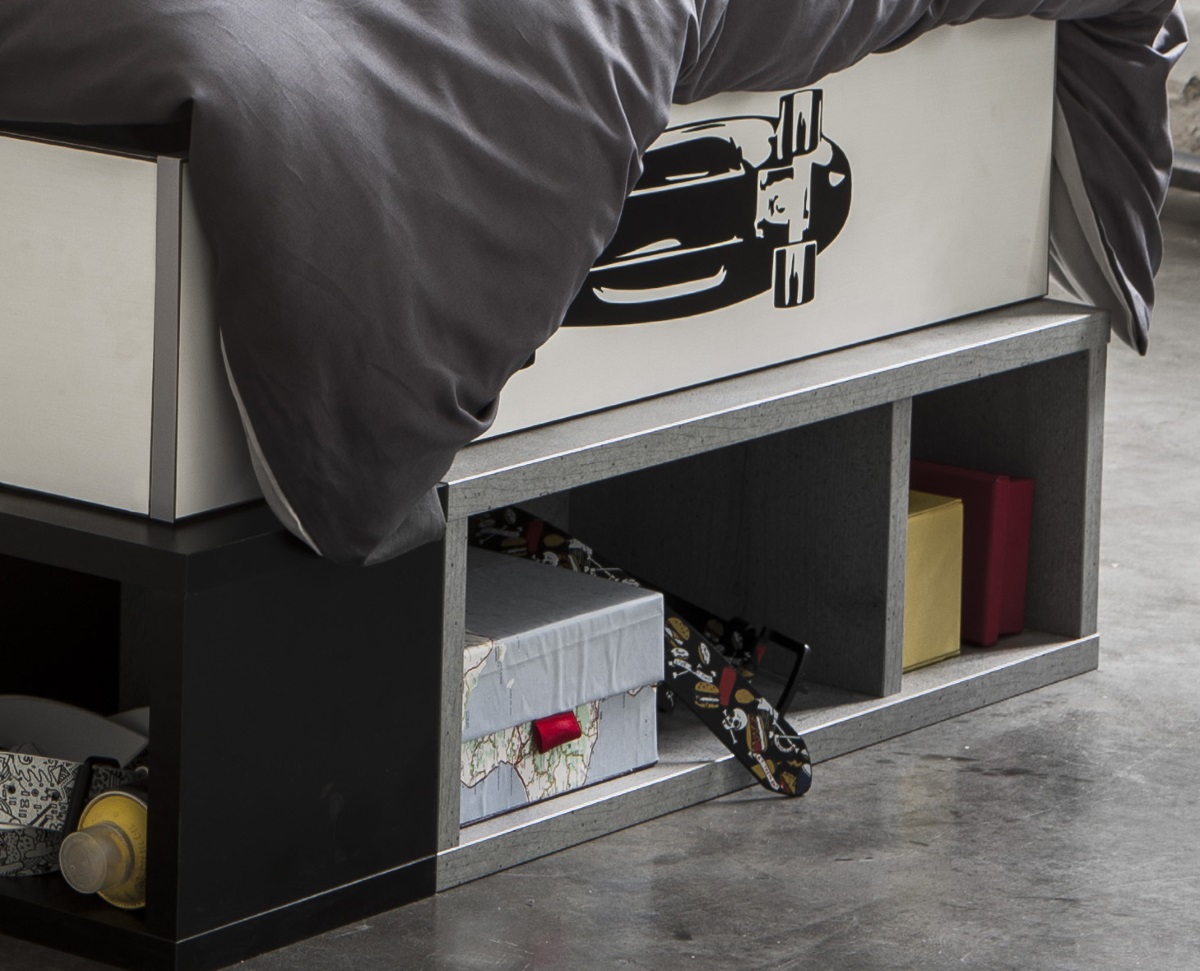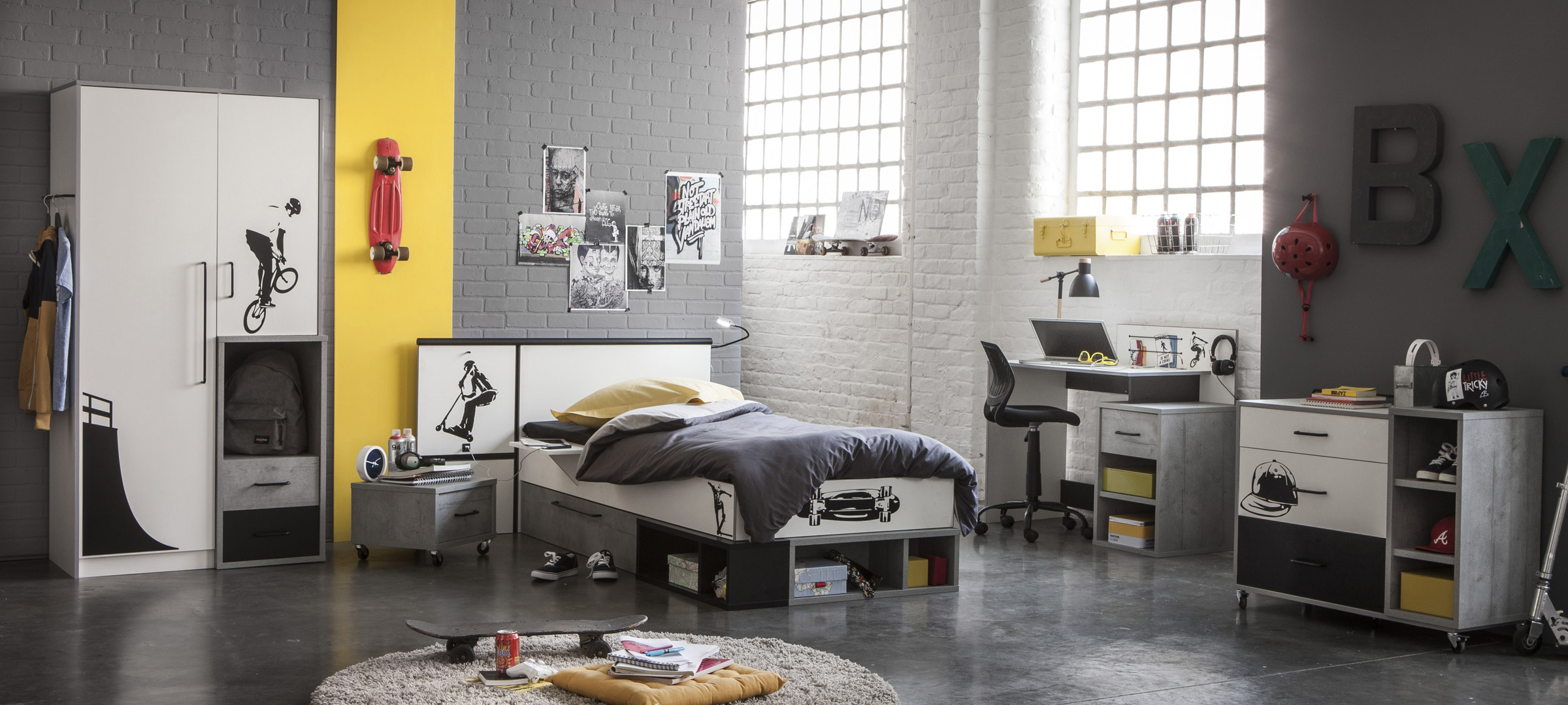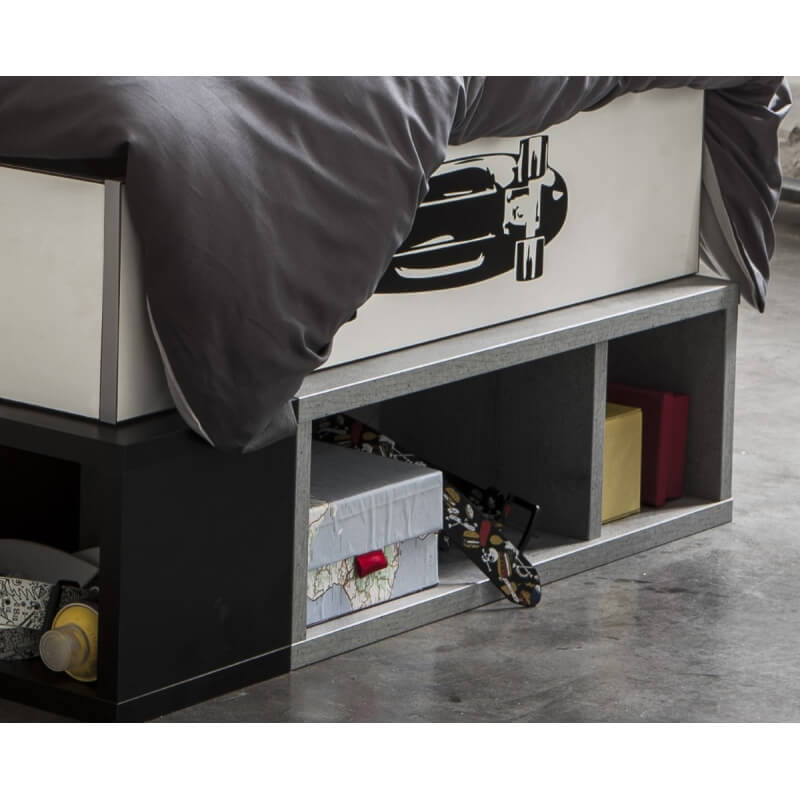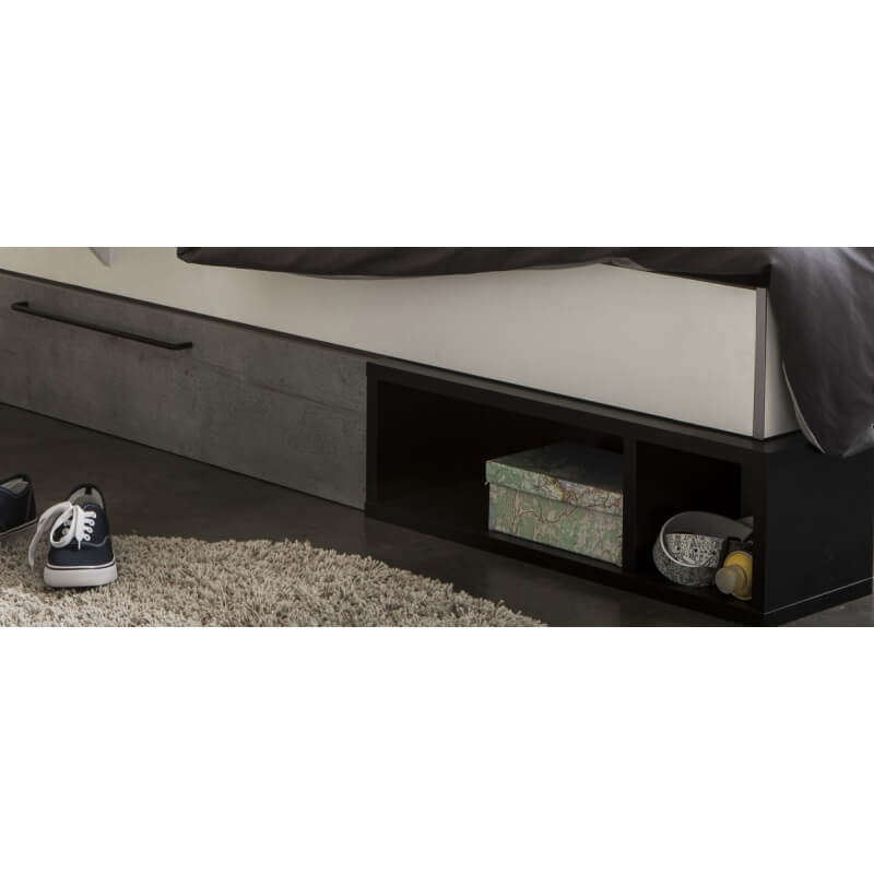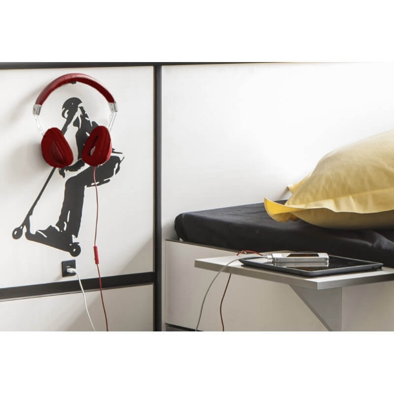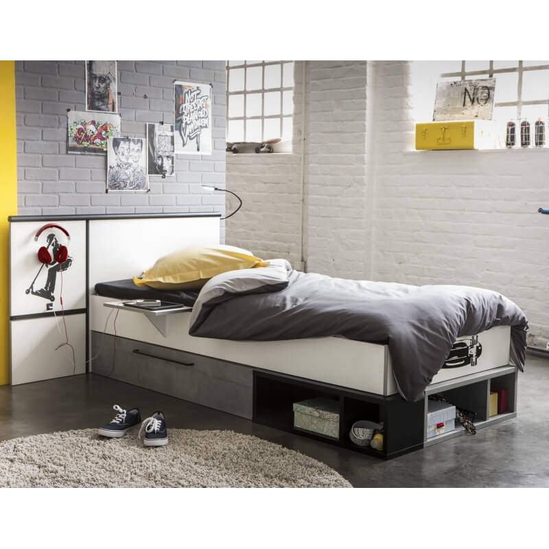 Le lit contemporain Baltimore seduira à coup sûr votre enfant grâce à ses coloris ultra tendance. Sa structure est fabriquée en panneaux de particules mélaminés de 15 et 22 mm d'épaisseur. Il offrira un couchage 90 x 200 cm. Il se compose d'un tiroir avec poignée en métal, de 4 niches de rangement, d'une liseuse led et d'une tablette positionnable des 2 côtés du lit. Sa large tête de lit offrira un excellent soutien. Il vous sera possible de positionner les stickers où bon vous semble. Pour un ensemble harmonieux, optez pour les autres éléments de la gamme Baltimore vendus séparément.