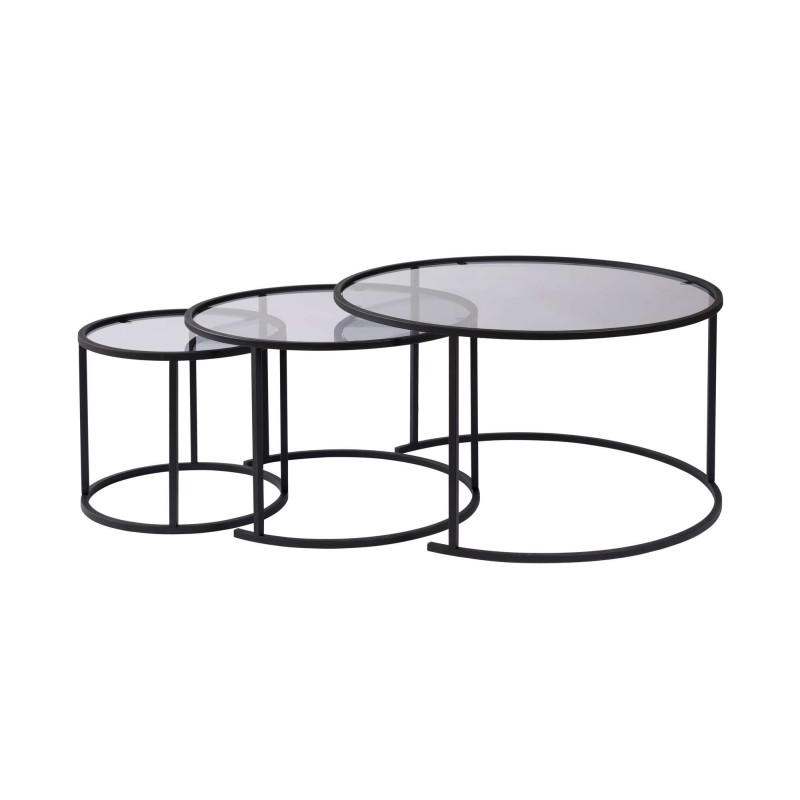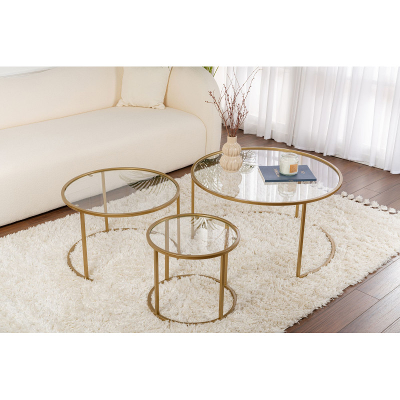 Le lot de 3 tables basses rondes Astonia de la marque Deladeco apporte une touche de sophistication contemporaine à votre espace de vie. Avec leurs trois tailles emboîtables (Ø 80 x H 43 cm, Ø 60 x H 39 cm et Ø 42 x H 35 cm), ces tables offrent une flexibilité d'aménagement remarquable qui s'adapte à tous vos besoins. Leur design épuré aux lignes géométriques fait de cette table basse un véritable élément de décoration qui habille avec élégance n'importe quel salon. Disponibles en deux finitions raffinées - noir/gris ou gold/transparent - elles se marient harmonieusement avec diverses ambiances décoratives, du style industriel au plus chic.