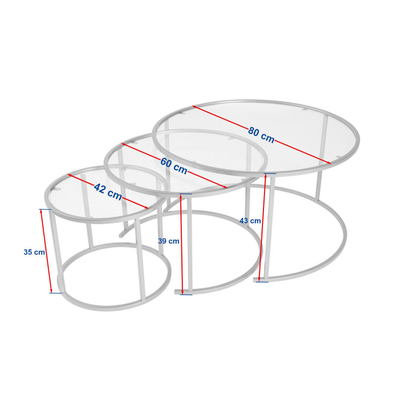 | Dimensions de la table | Ø 42 x H 35 cm - Ø 60 x H 39 cm - Ø 80 x H 43 cm |