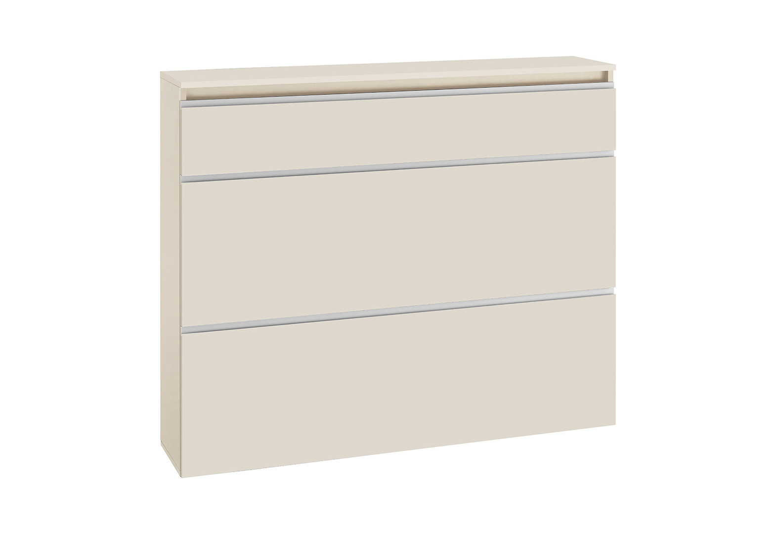 Avec ses dimensions généreuses (L 120 x H 108 x P 27 cm), ce rangement à chaussures propose une capacité d’accueil optimisée grâce à ses trois portes battantes. Il est fabriqué à partir de panneaux de particules mélaminés de 16 mm d’épaisseur, garantissant robustesse et durabilité au quotidien. La finition mélaminée dans des tons cachemire et chêne apporte chaleur et raffinement à votre pièce, tout en facilitant l’entretien avec un simple chiffon doux et humide.