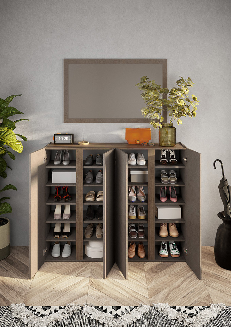 Son style moderne se marie parfaitement avec une entrée contemporaine ou un meuble d’entrée coordonné, créant une atmosphère harmonieuse dès le premier regard. Avec ses quatre portes battantes soigneusement finies en mélaminé, le meuble Frida offre un accès pratique à l’ensemble de son volume interne. La hauteur de 111 cm permet de disposer d’une belle capacité de stockage, idéale pour les familles souhaitant intégrer un rangement à chaussures efficace tout en privilégiant une esthétique élégante et actuelle.