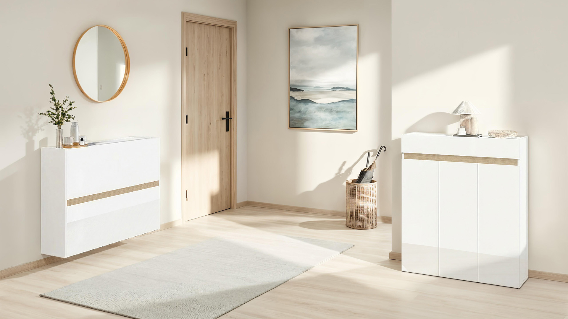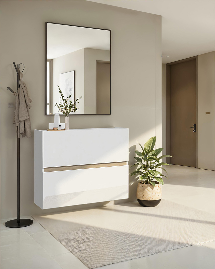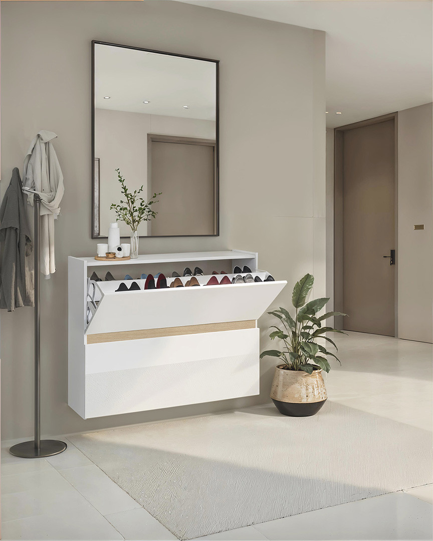Ce rangement à chaussures suspendu est pensé pour maximiser l'espace au sol tout en offrant une capacité de stockage impressionnante pouvant accueillir jusqu'à 20 paires de chaussures. Grâce à sa fixation murale, il libère entièrement le sol de votre couloir, facilitant le nettoyage et donnant une impression d'espace et de légèreté à votre pièce d'entrée. Ses deux portes battantes équipées de charnières avec frein et d'un système Soft-closing garantissent une fermeture douce et silencieuse, sans claquements intempestifs, pour un usage quotidien aussi agréable que pratique au sein de votre foyer.