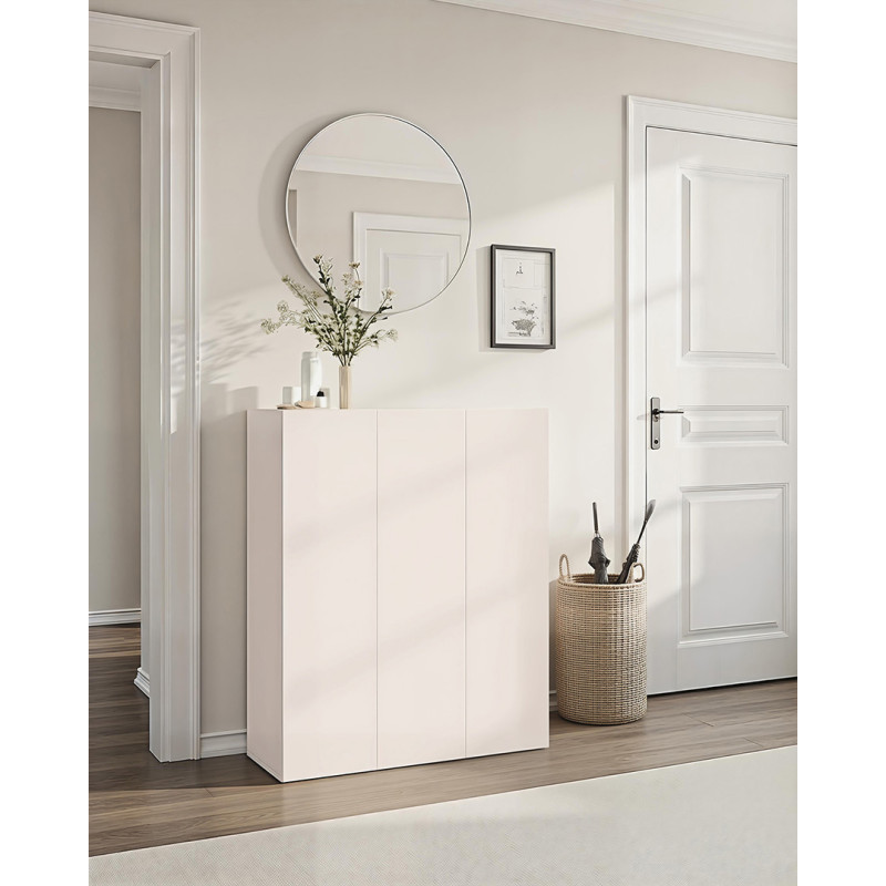 Côté dimensions, le modèle Runny affiche une longueur de 103 cm, une hauteur de 77 cm et une profondeur de 28 cm, offrant un volume de rangement à chaussures généreux pour toute la famille. Sa structure en panneaux de particules mélaminés haute qualité de 18 mm garantit une robustesse à toute épreuve, tandis que la finition mélaminée assure une résistance durable aux rayures et aux chocs du quotidien. Ce meuble d'entrée peut accueillir jusqu'à 20 paires de chaussures, ce qui en fait une solution de stockage particulièrement adaptée aux familles nombreuses comme aux espaces plus intimistes.
