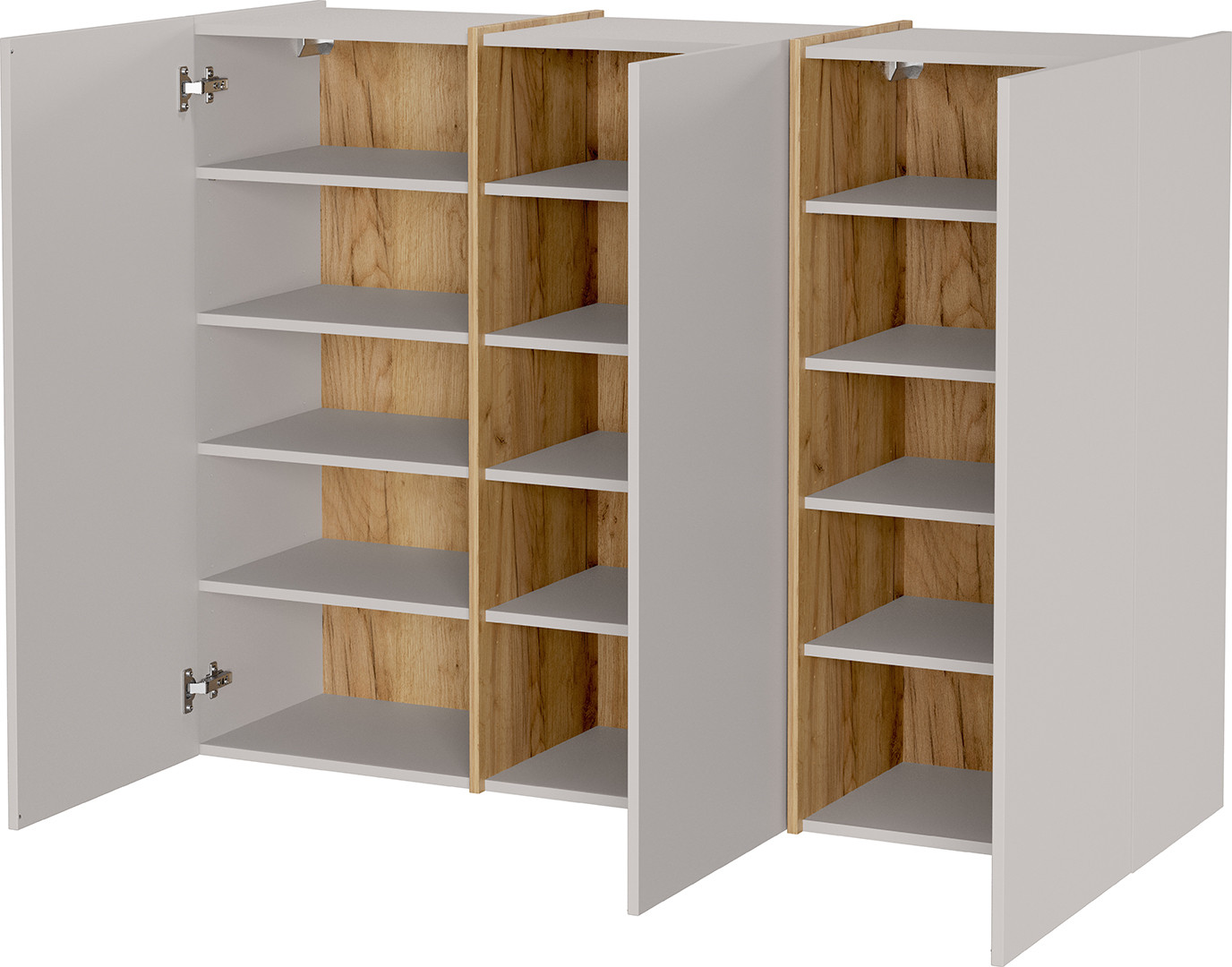 Mesurant 138 cm de longueur, 103 cm de hauteur et 38 cm de profondeur, ce rangement à chaussures suspendu offre une capacité généreuse tout en restant discret. Sa structure est conçue en panneaux de particules mélaminés de haute qualité, lui conférant solidité et stabilité. Il est équipé de trois portes battantes à ouverture amortie, assurant une manipulation fluide et silencieuse. À l’intérieur, huit étagères réglables permettent de personnaliser l’agencement selon vos besoins, que vous souhaitiez y ranger des baskets, des bottines ou des escarpins. Chaque étagère supporte une charge maximale de 7 kg, ce qui rend ce meuble particulièrement fonctionnel pour les familles ou les collectionneurs de chaussures.